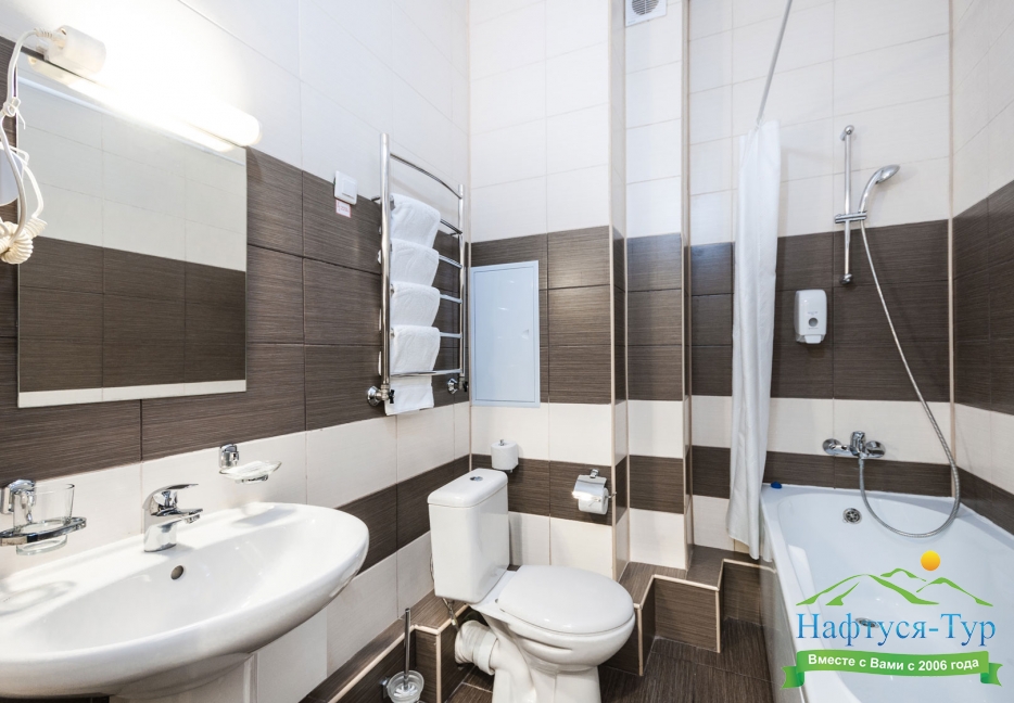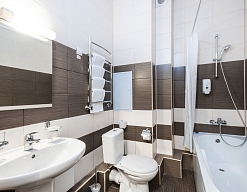 с ванной или душевой кабиной, туалетные принадлежности, фен