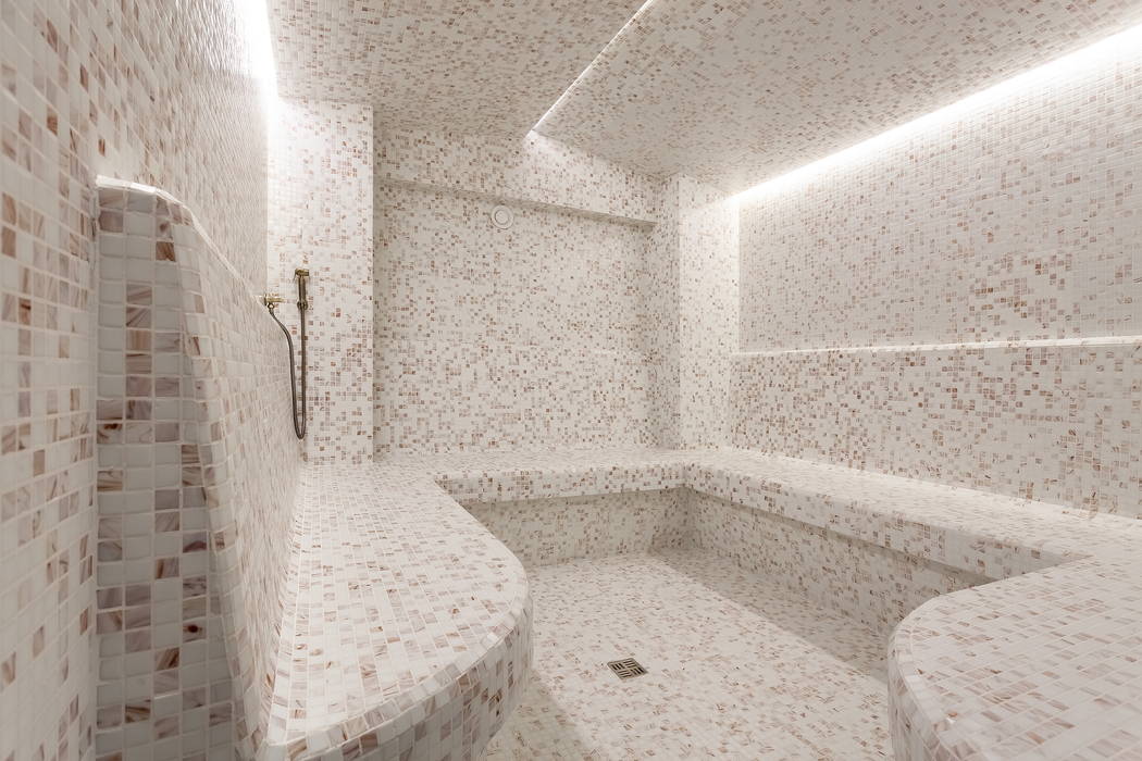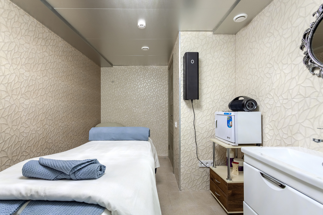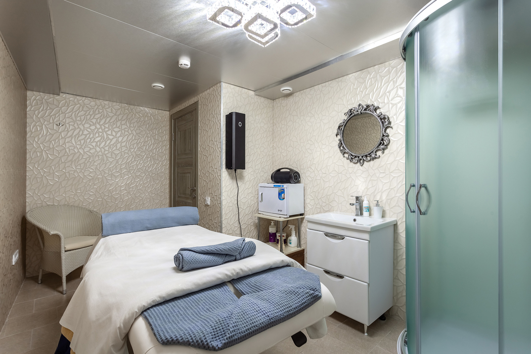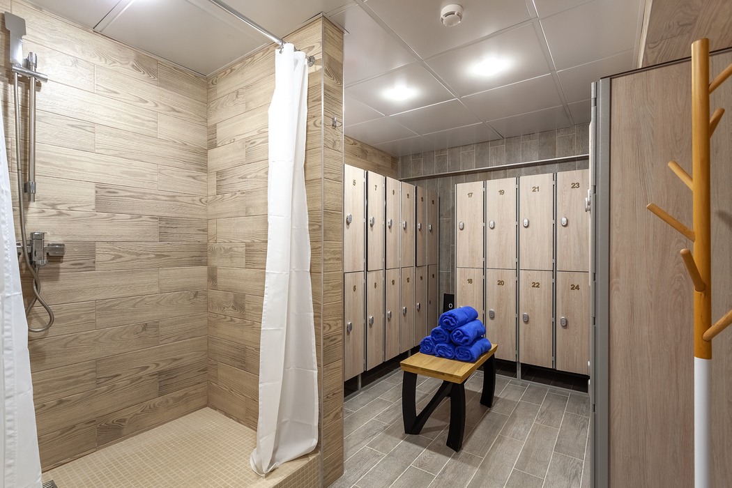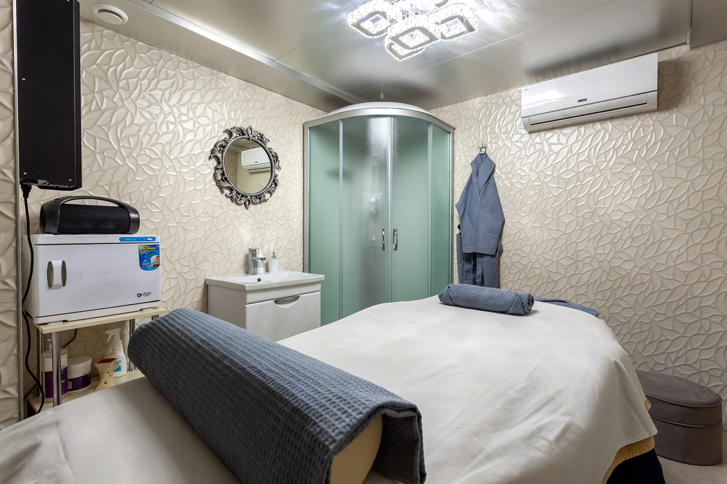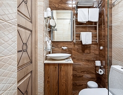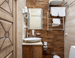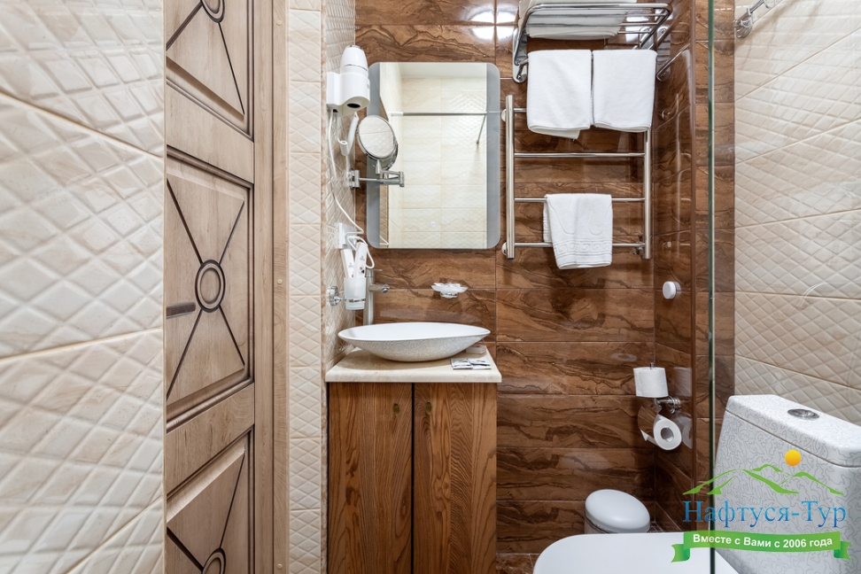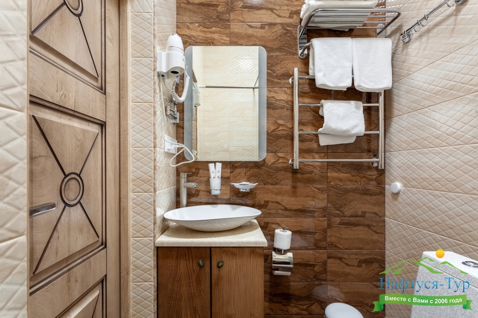 с душем, тапочки, туалетные принадлежности, фен, халат