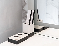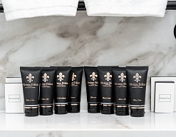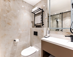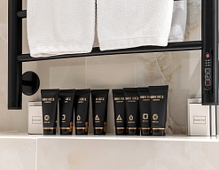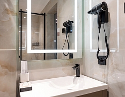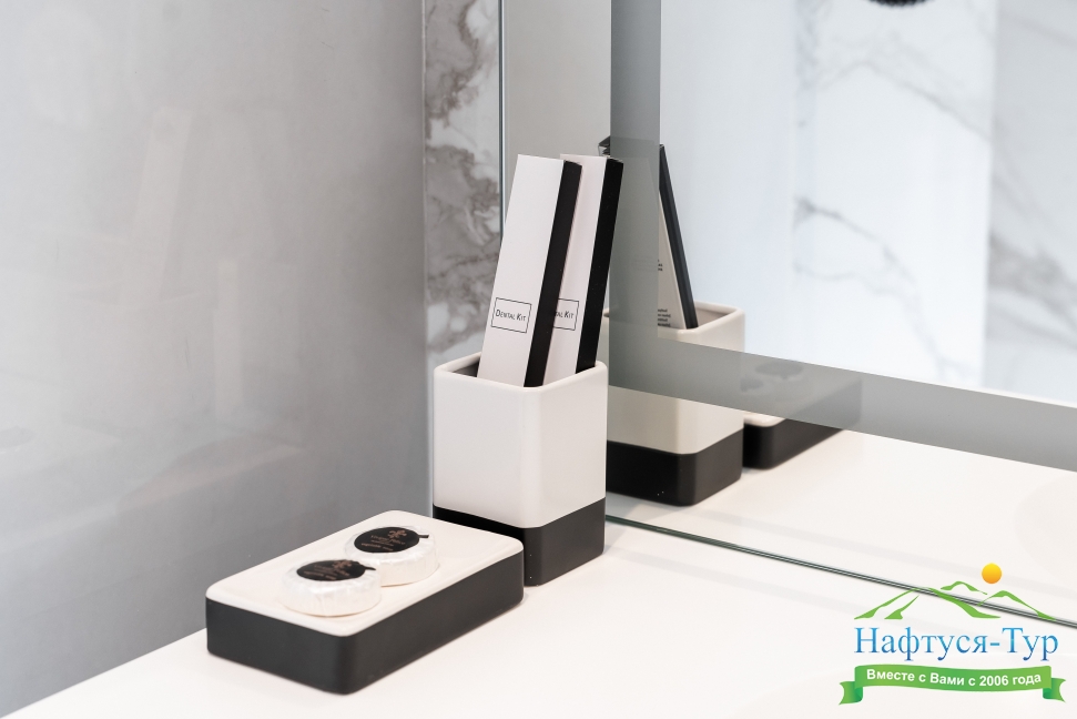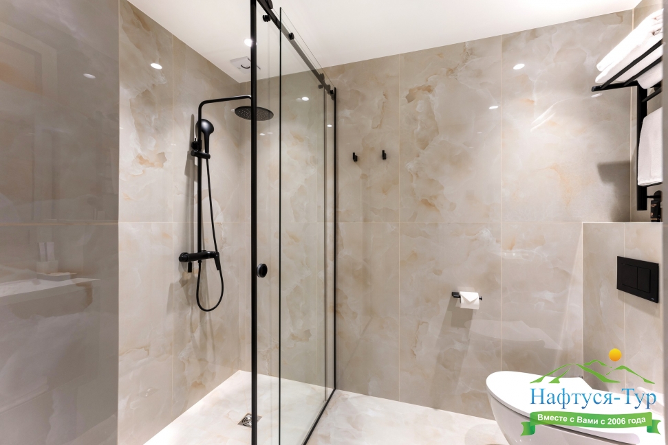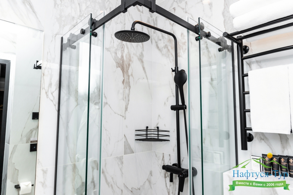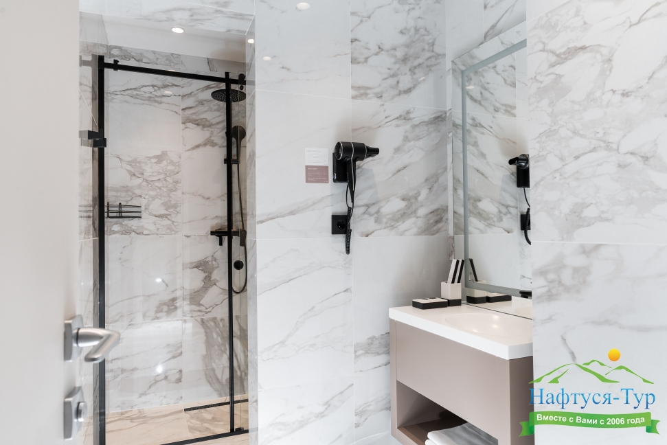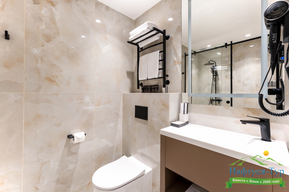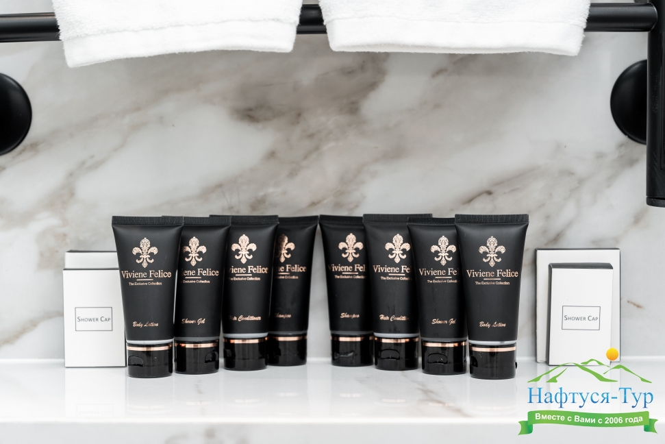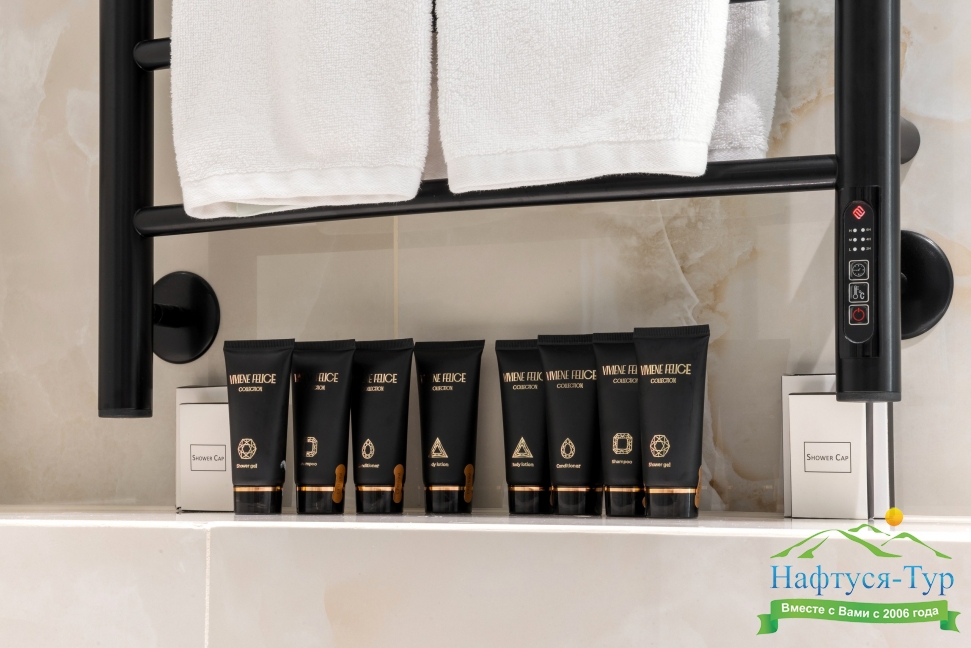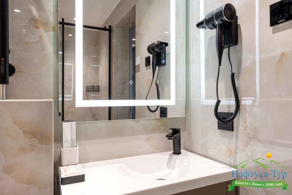 с душем, тапочки, туалетные принадлежности, фен, халат