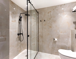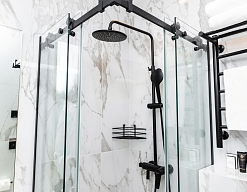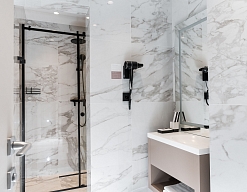 с душевой кабиной, тапочки, туалетные принадлежности, фен, халат
