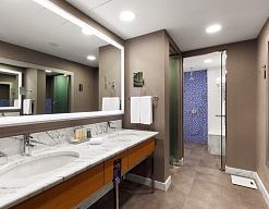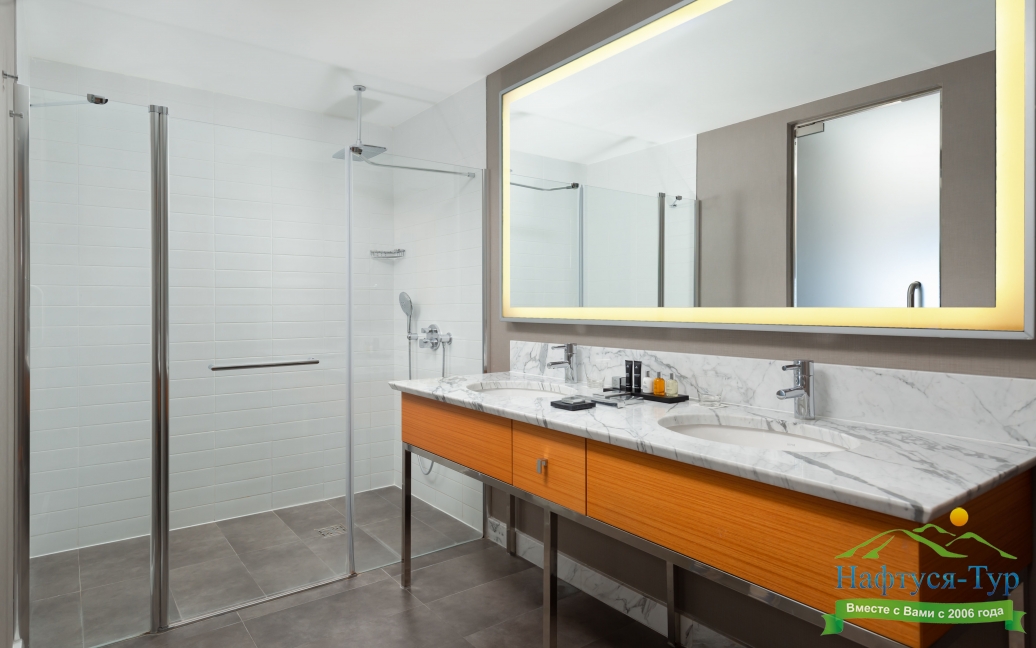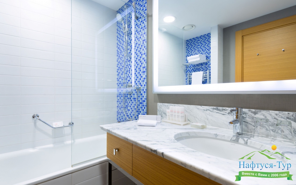 с ванной и душевой кабиной, тапочки, туалетные принадлежности, фен, халат