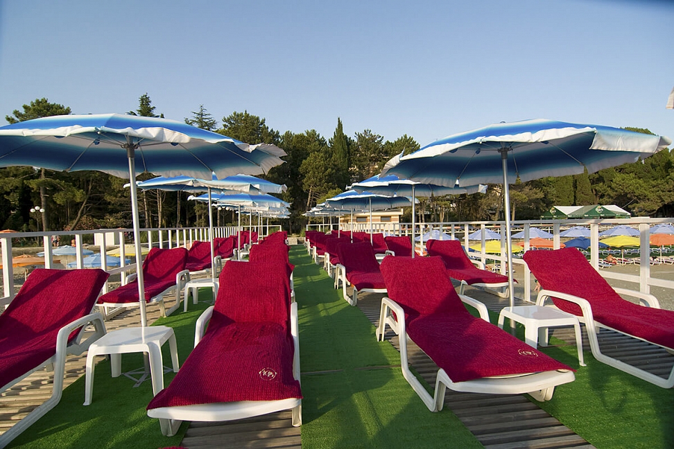 Бассейн оборудован шезлонгами, пляжными зонтами и душевыми кабинками.