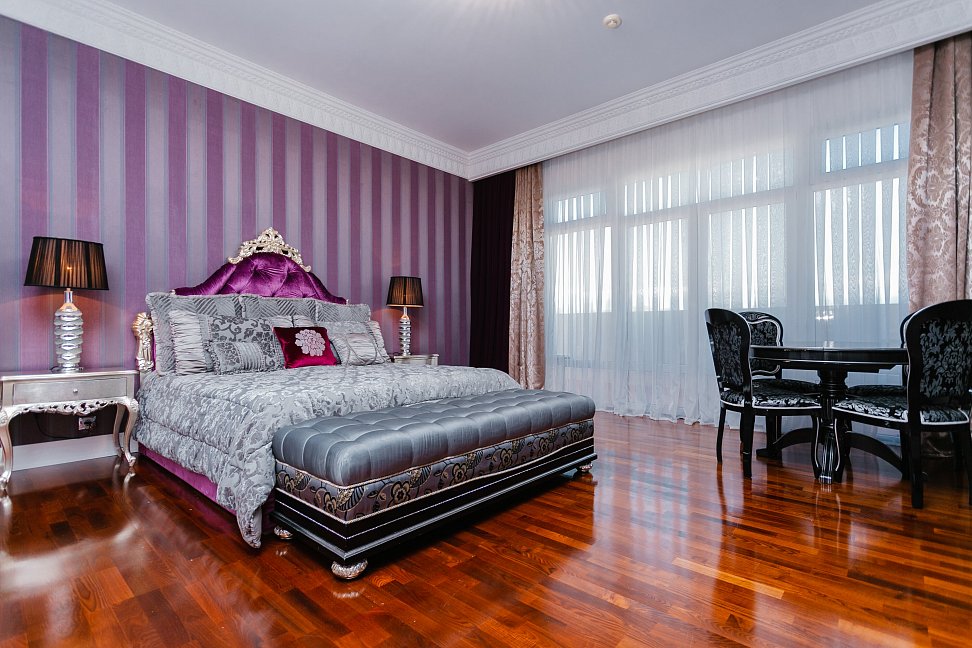 кровать двуспальная, прикроватные тумбочки, стол, стулья, тумба под телевизор, шкаф