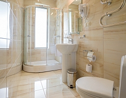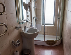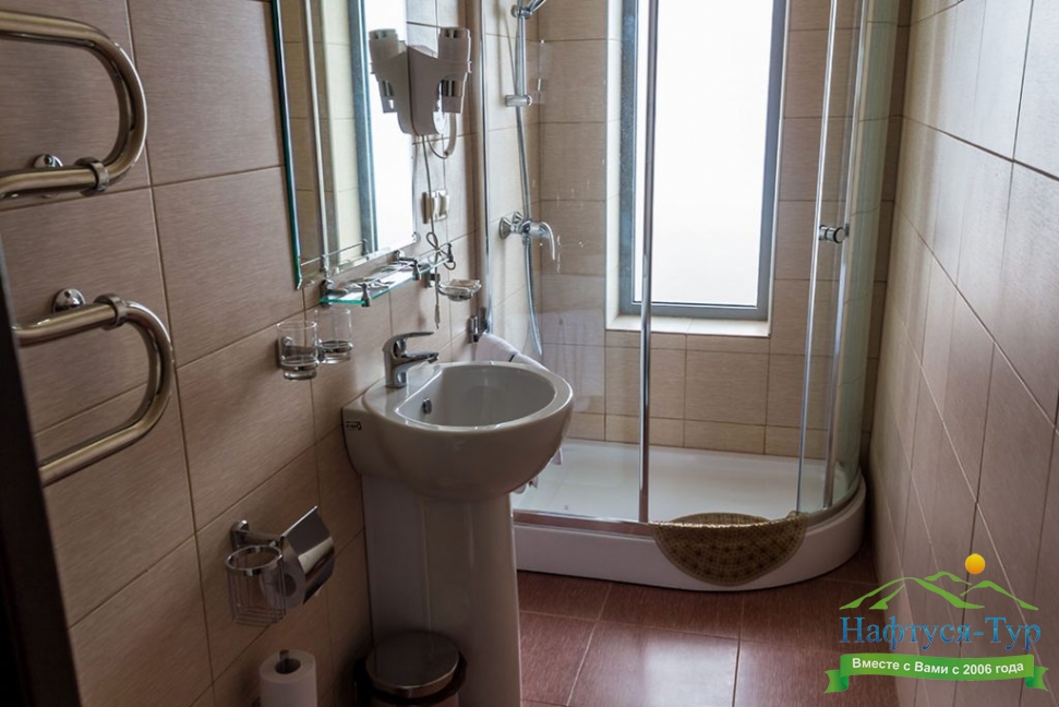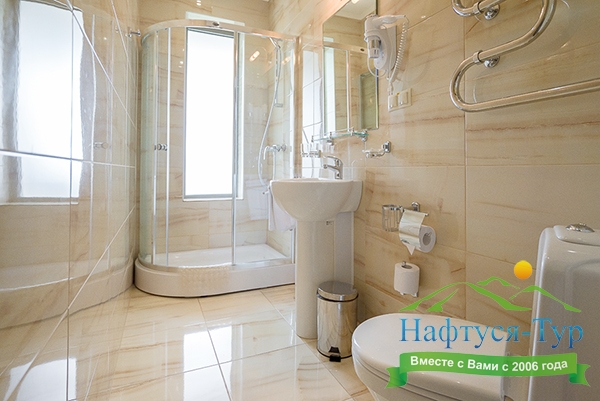 с душевой кабиной, тапочки, туалетные принадлежности, фен, халат