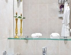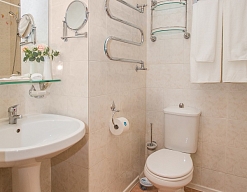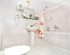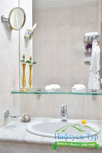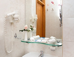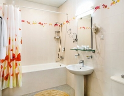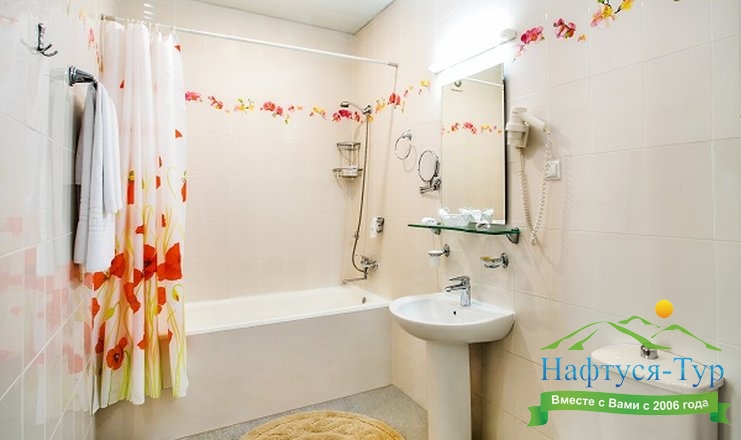 с ванной или душевой кабиной, тапочки, туалетные принадлежности, фен, халат