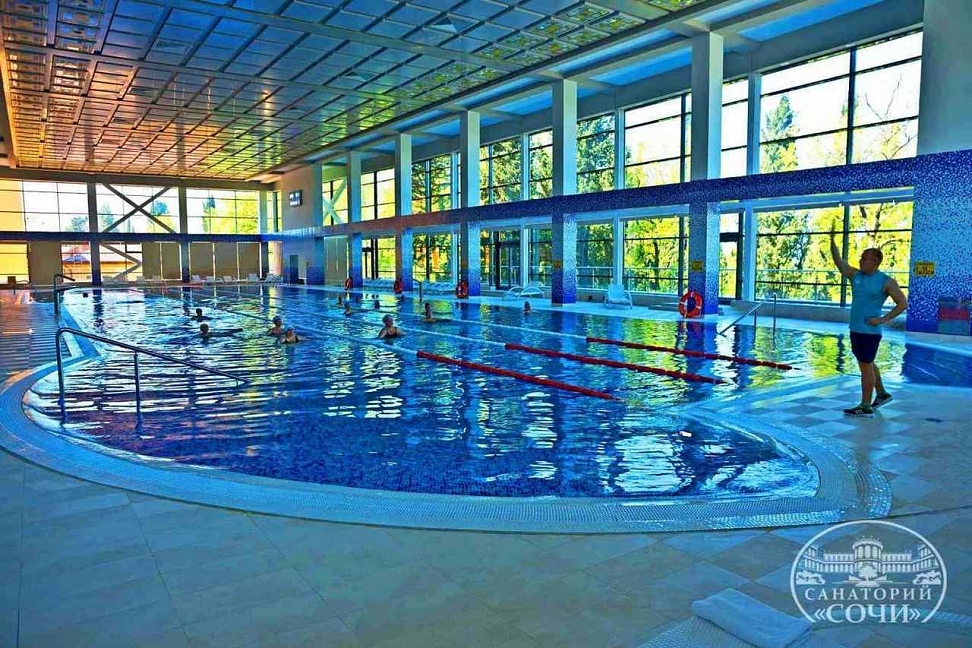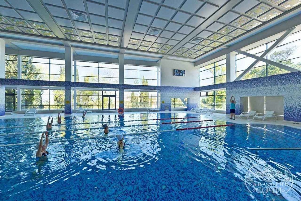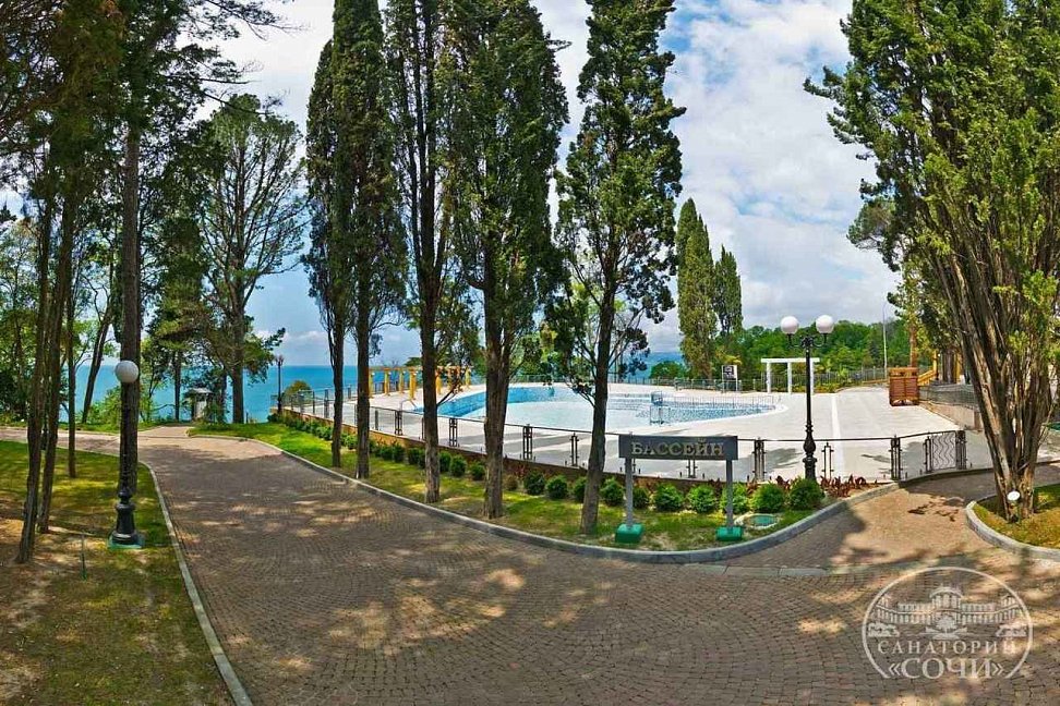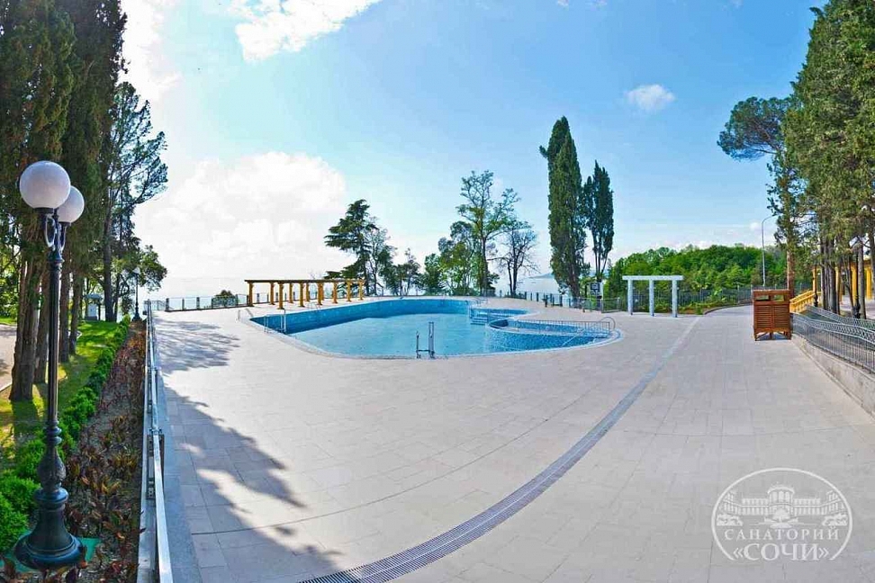 На территории санатория есть большой бассейн, окруженный зелеными насаждениями, где гости могут отлично провести время и насладиться прохладой в жаркую погоду. Рядом с бассейном расположены шезлонги и зонты для удобства гостей.