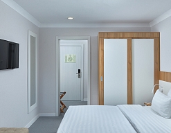 зеркало, кровати односпальные /одна двуспальная кровать, прикроватные тумбочки, стол, стул, тумба багажная, шкаф-купе