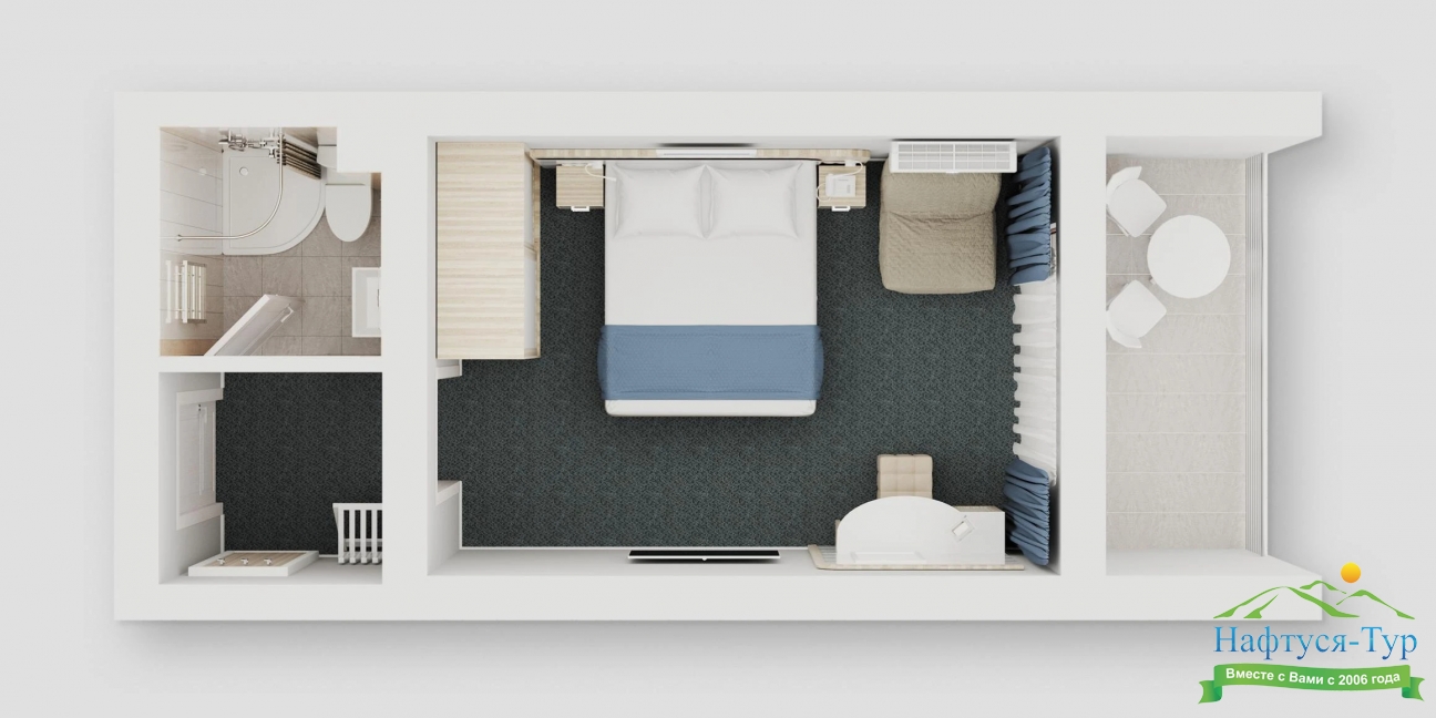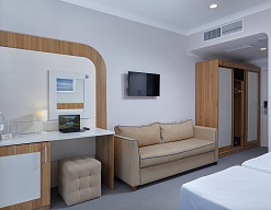 кресло-кровать, кровать двуспальная, прикроватные тумбочки, столик туалетный, стул, тумба багажная, шкаф