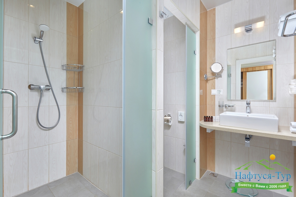 2 санузла, с душевой кабиной, тапочки, туалетные принадлежности, фен, халат