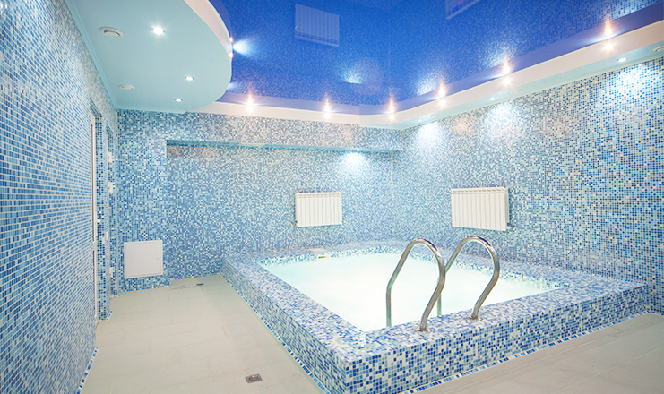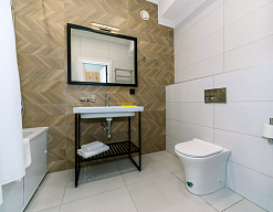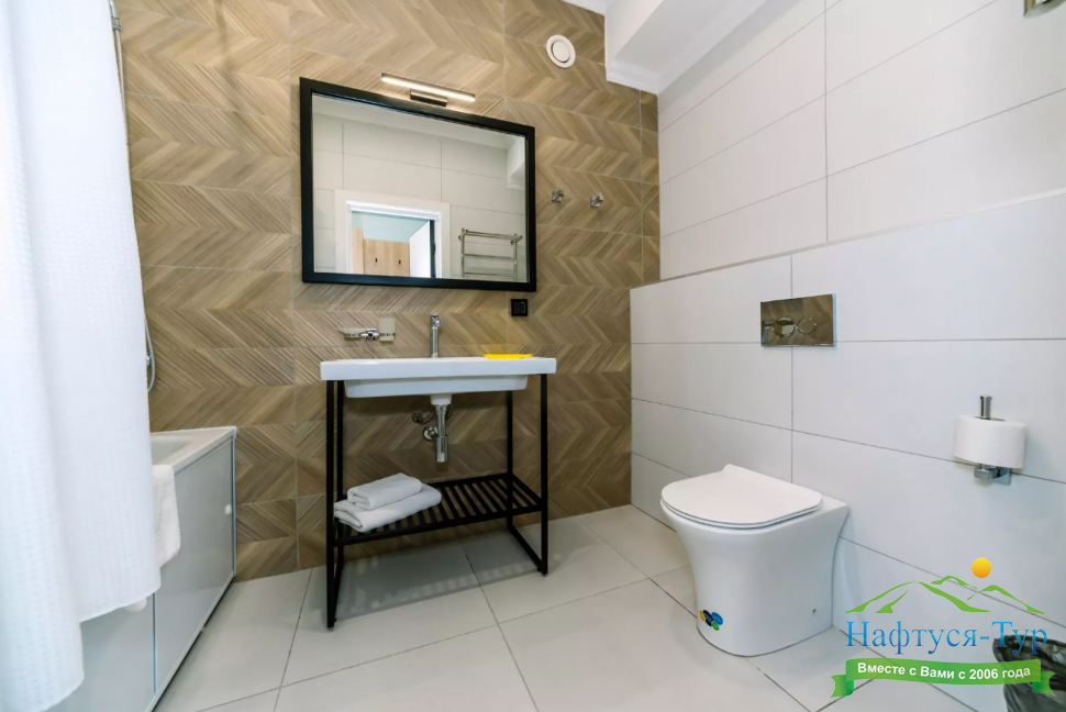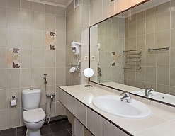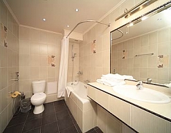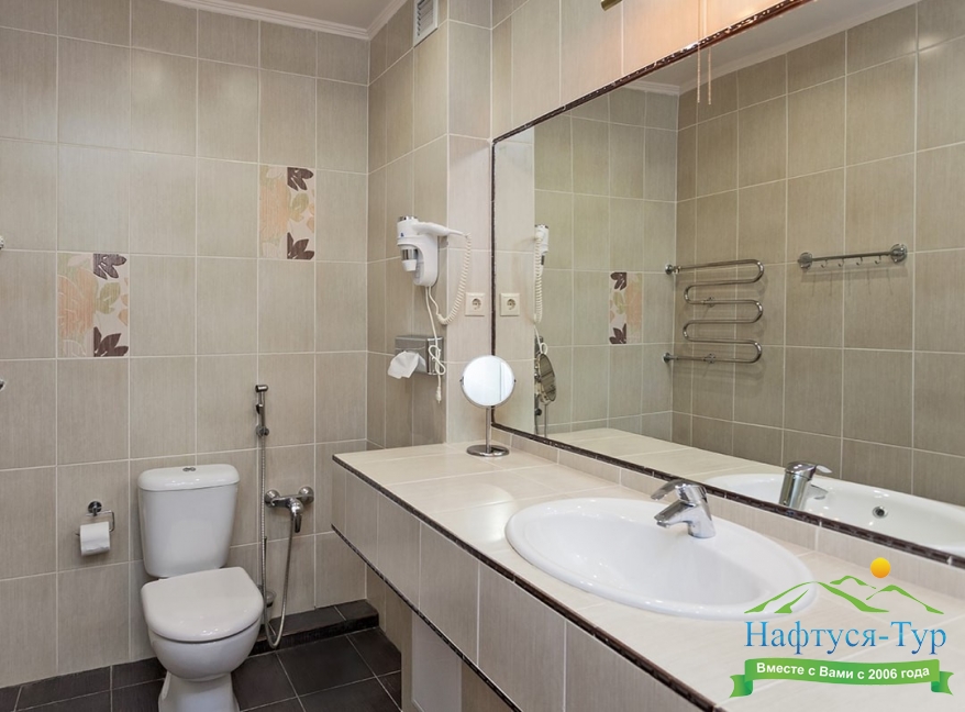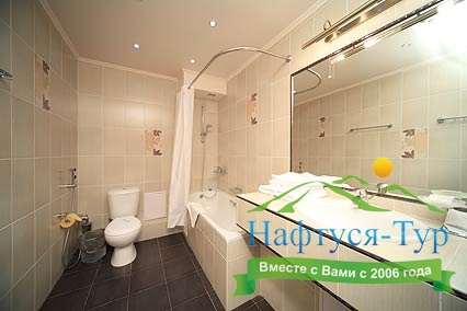 с ванной, тапочки, туалетные принадлежности, фен, халат