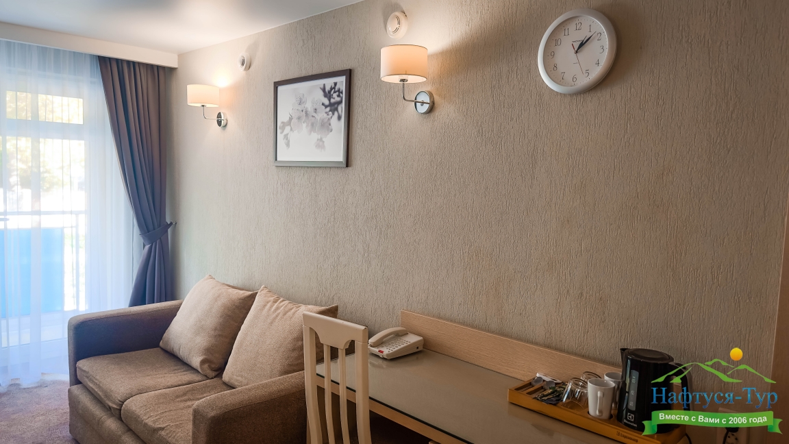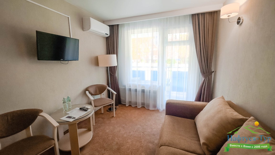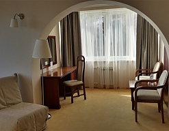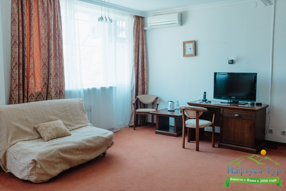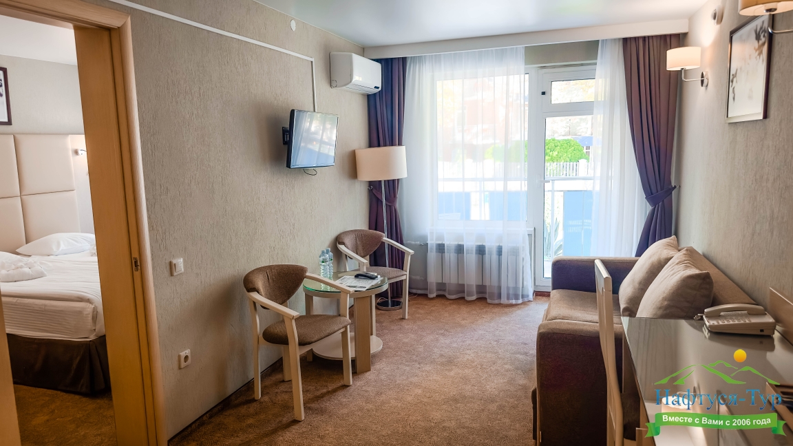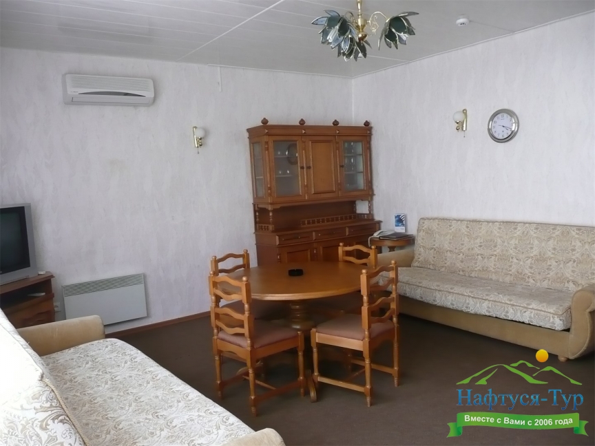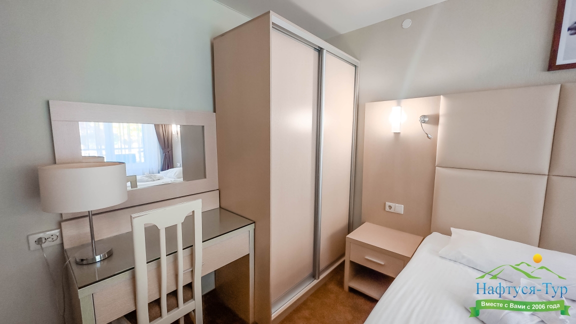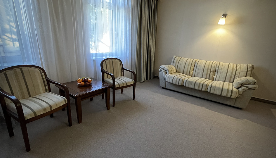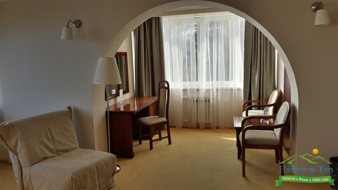 Отдыхали в мае 2016 года. Впечатления не самые положительные. В номере из описанного спектра принадлежностей ,некоторые отсутствуют. В спальне: на тумбочках пыль, на дверях жирные пятна. Чехлы на креслах и диване в пятнах.