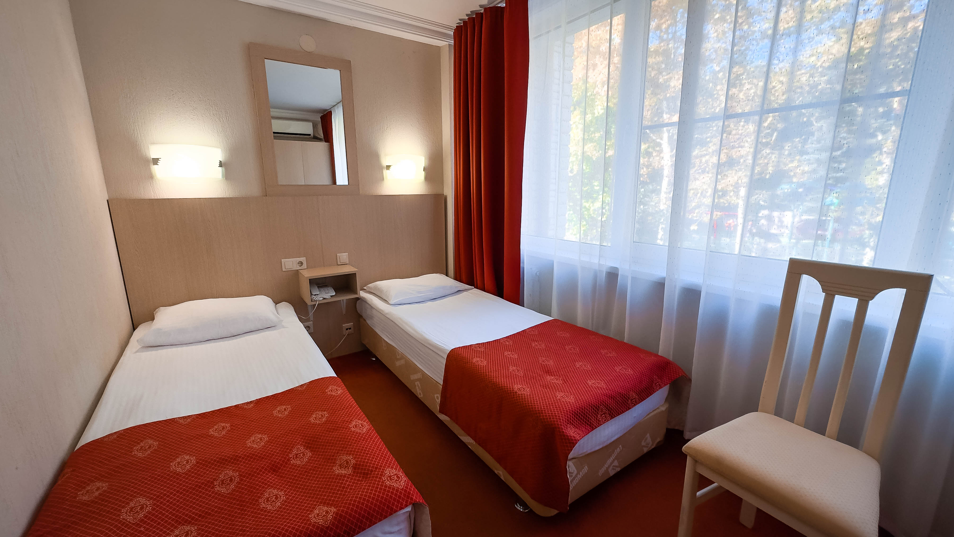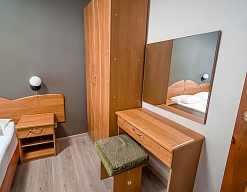 вешалка, зеркало, кровати односпальные, прикроватные тумбочки, стол, стул, шкаф