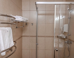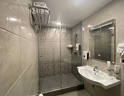 с душевой кабиной, тапочки, туалетные принадлежности, фен, халат