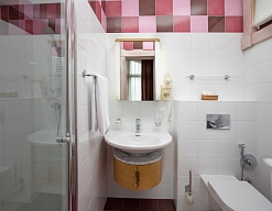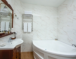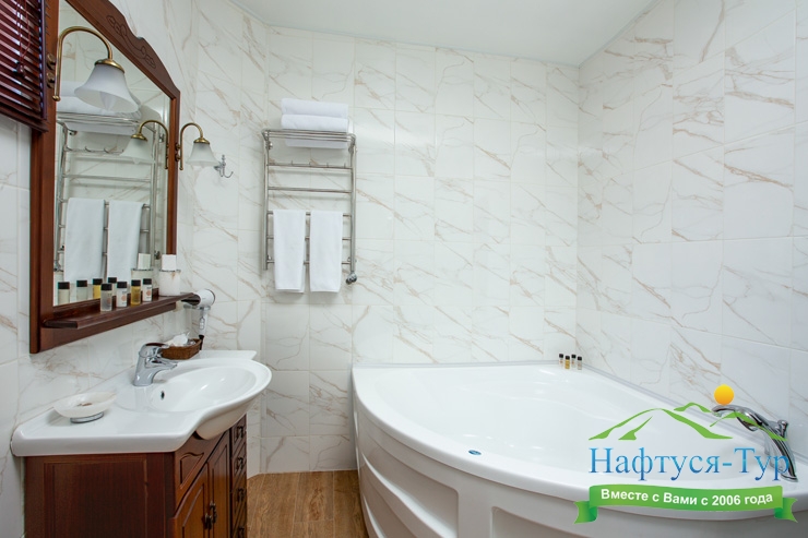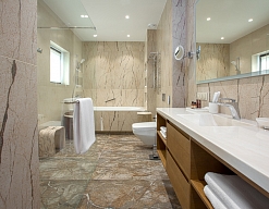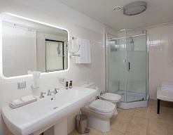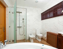 биде, с ванной и душевой кабиной, тапочки, туалетные принадлежности, фен, халат
