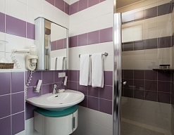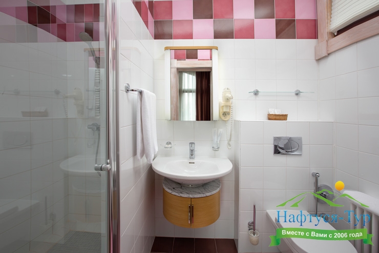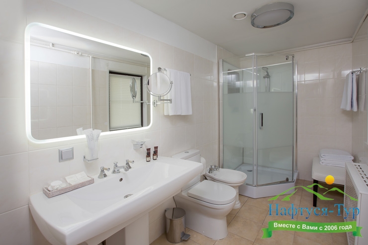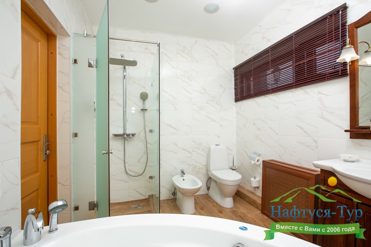 биде, с душевой кабиной, тапочки, туалетные принадлежности, фен, халат
