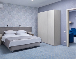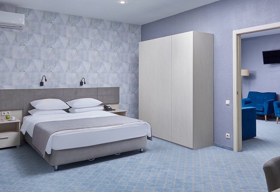 вешалка, диван, кровать двуспальная/ две полутороспальные кровати, прикроватные тумбочки, стол, стулья, шкаф
