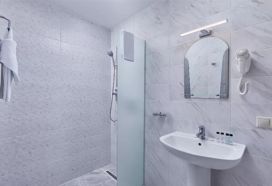с душевой кабиной, туалетные принадлежности, фен