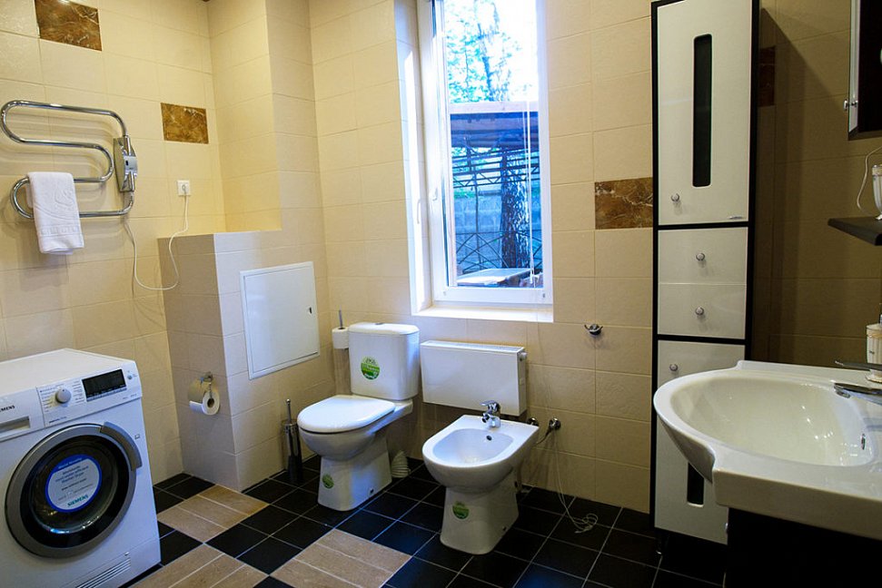 биде, с душем или ванной, тапочки, туалетные принадлежности, фен, халат