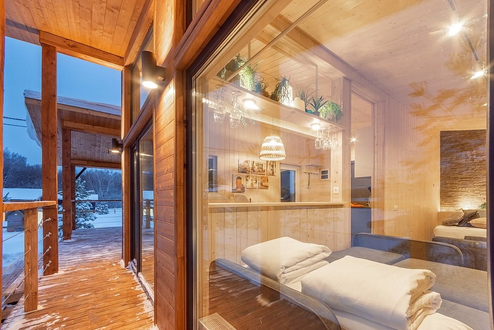 Самолетом до аэропорта г. Тула, далее 1 км до остановки общественного транспорта и на автобусе №170 двигаться до остановки «Ясногорск», далее сделать пересадку на автобус №176, 179 и двигаться до остановки «Подосинки-Лэнд», далее 1,67 км до коттеджного комплекса.
