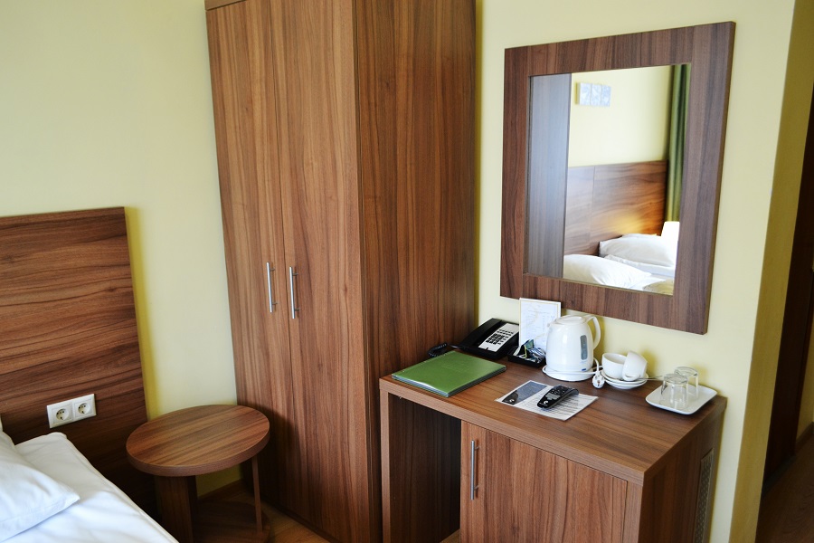 вешалка, диван, зеркало, кровати односпальные /одна двуспальная кровать, прикроватные тумбочки, стол, стулья, шкаф