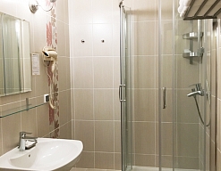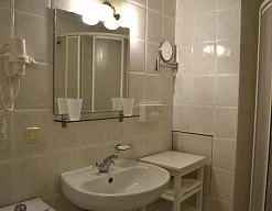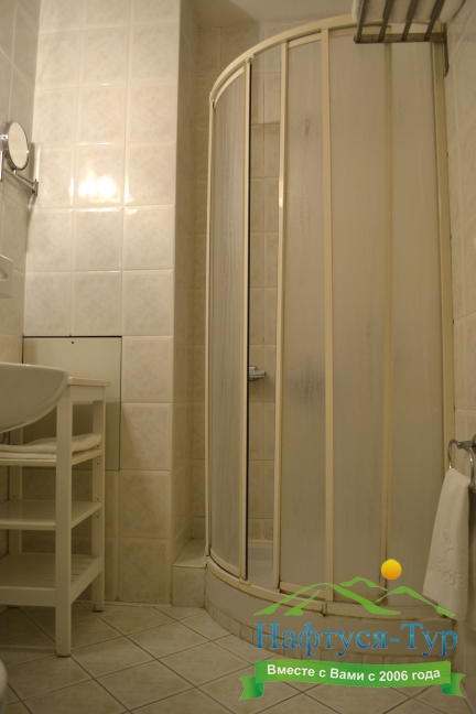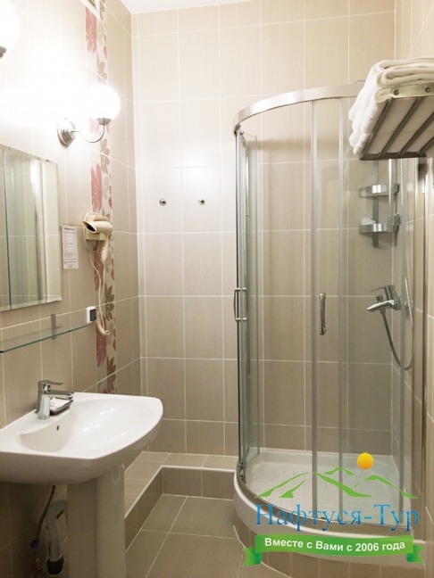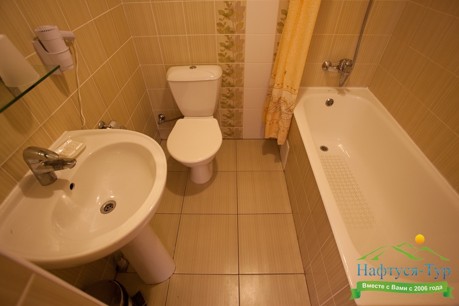 с душем или ванной, тапочки, туалетные принадлежности, фен