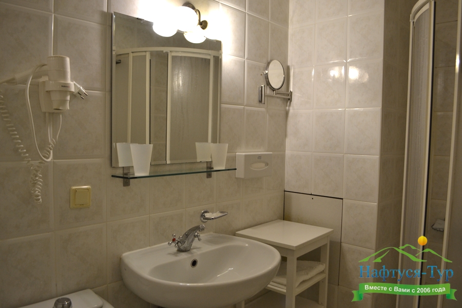 с душем, тапочки, туалетные принадлежности, фен