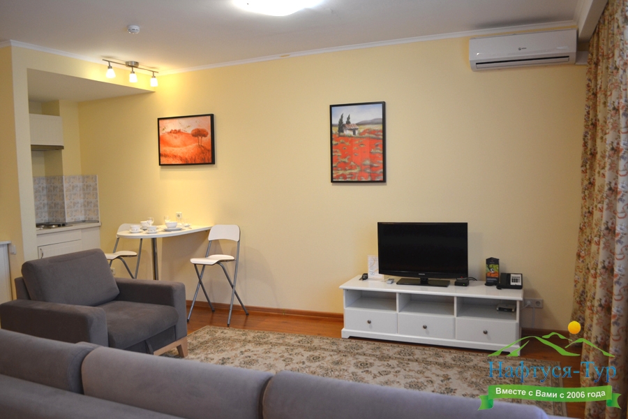 кондиционер, микроволновая печь, мини-холодильник, набор посуды, телевизор, телефон, электрическая плита