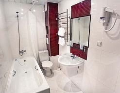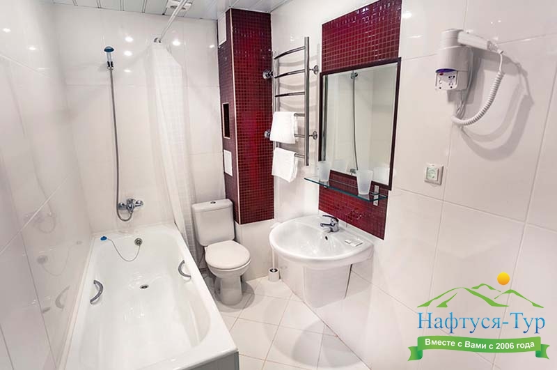 с ванной, тапочки, туалетные принадлежности, фен