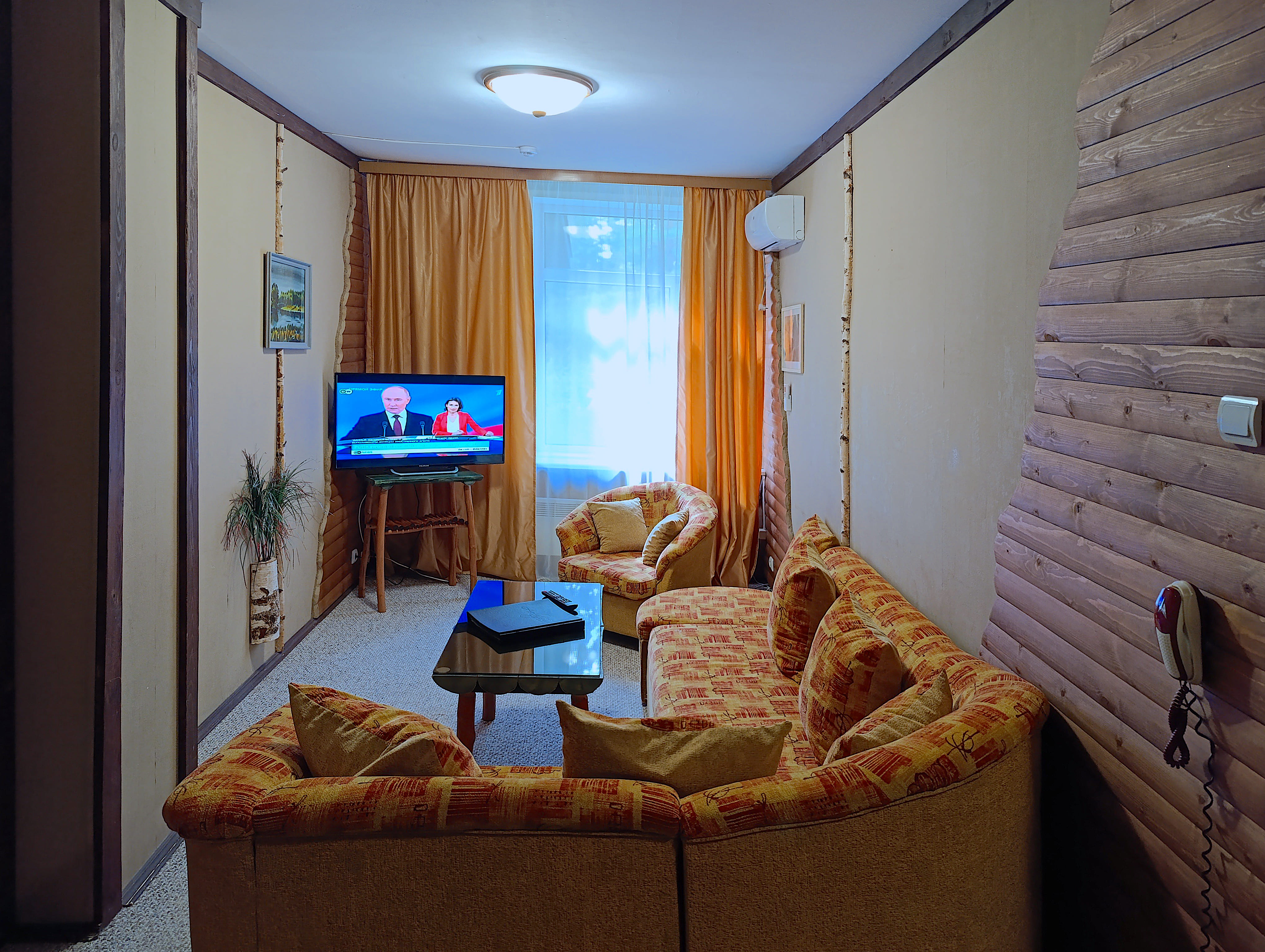 гладильная доска, кондиционер, телевизор ЖК, телефон, холодильник, чайный набор посуды, электрочайник