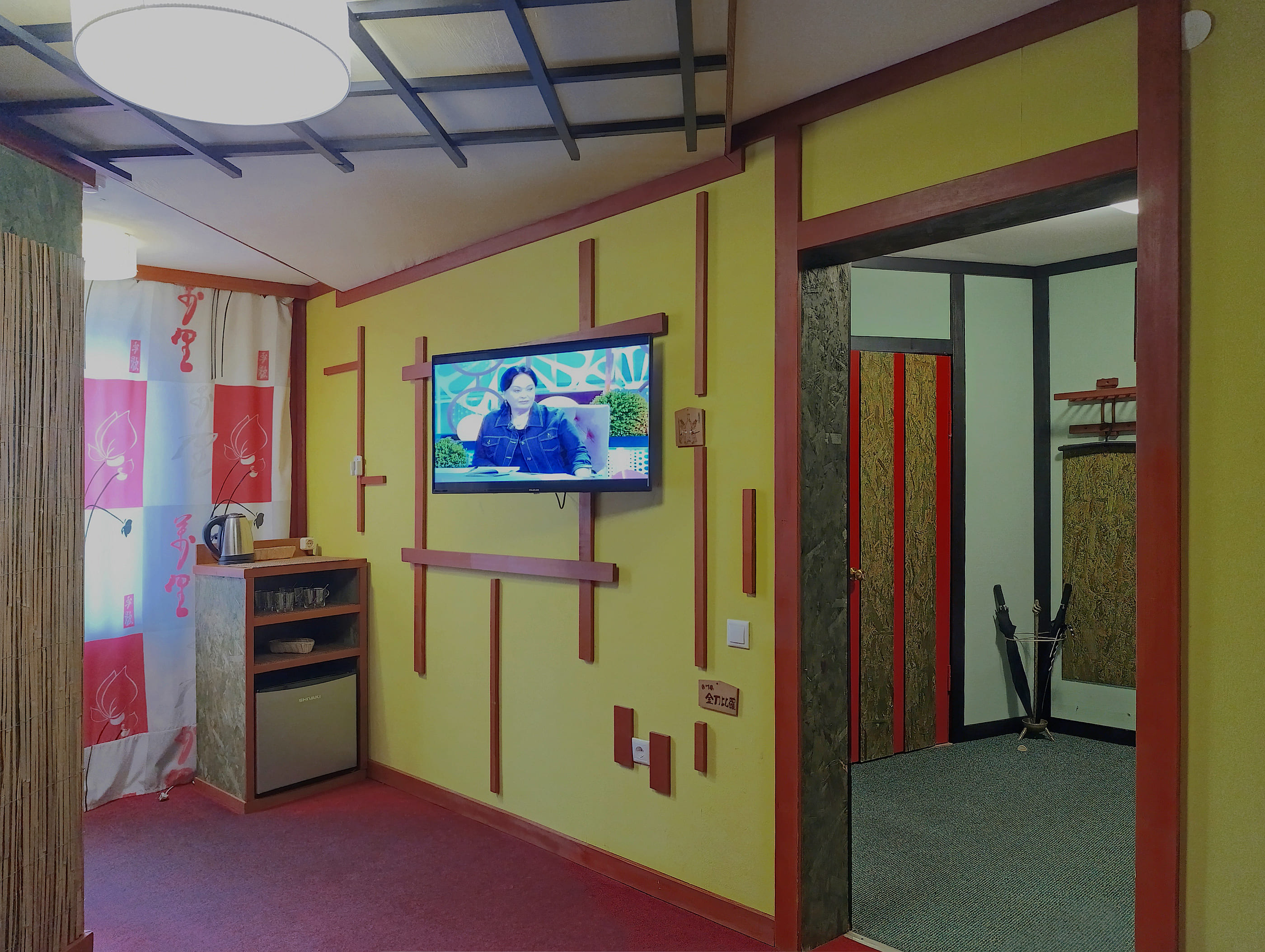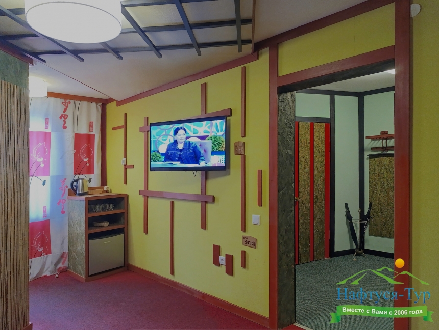 гладильная доска, телевизор ЖК, телефон, утюг, чайный набор посуды, электрочайник
