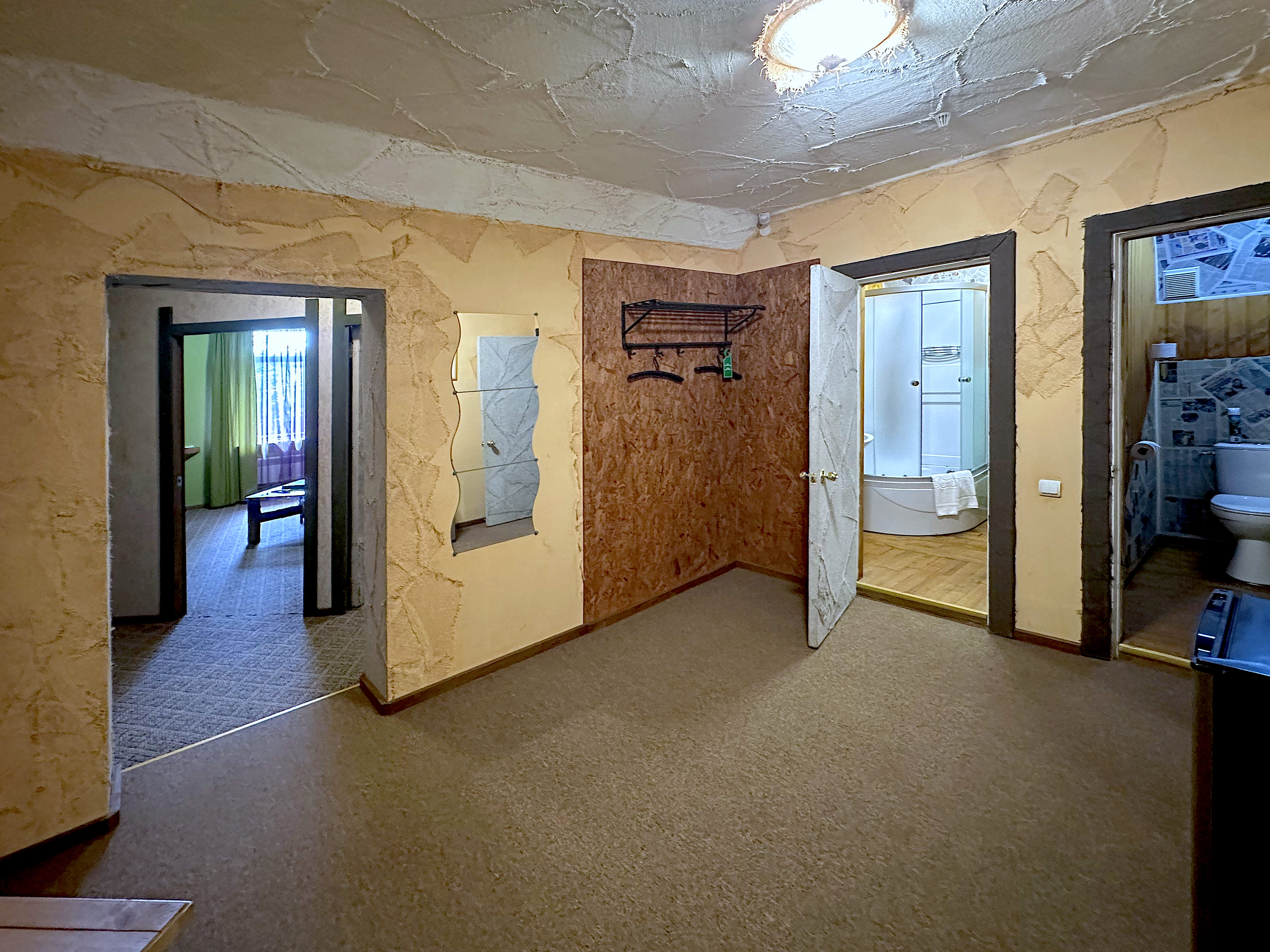 вешалка, диван, зеркало, кровати односпальные, прикроватные тумбочки, стол, столик журнальный, стулья, тумба багажная, шкаф