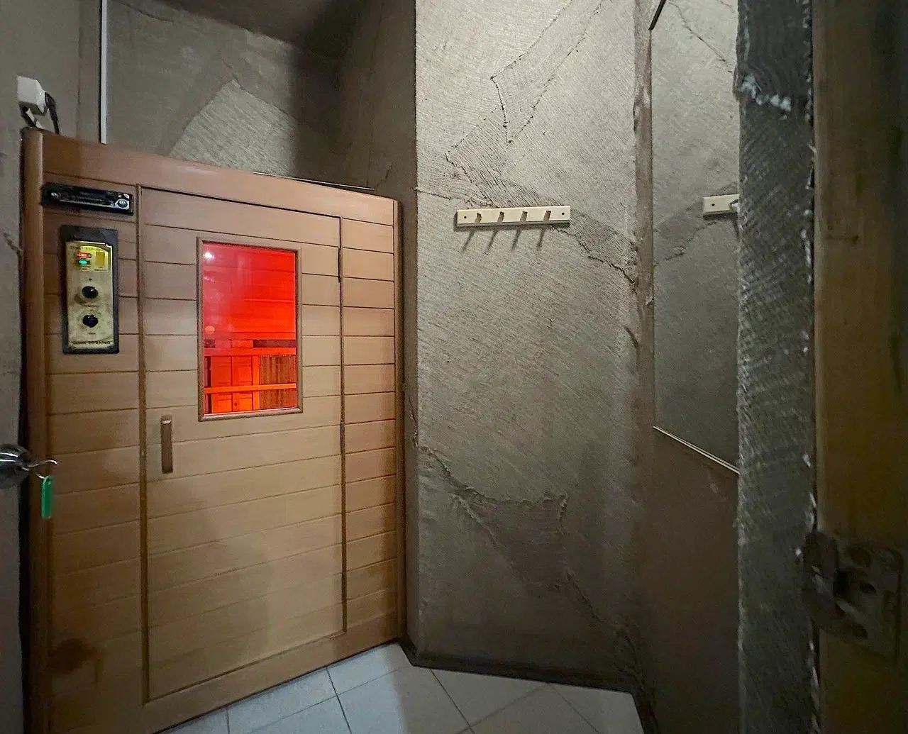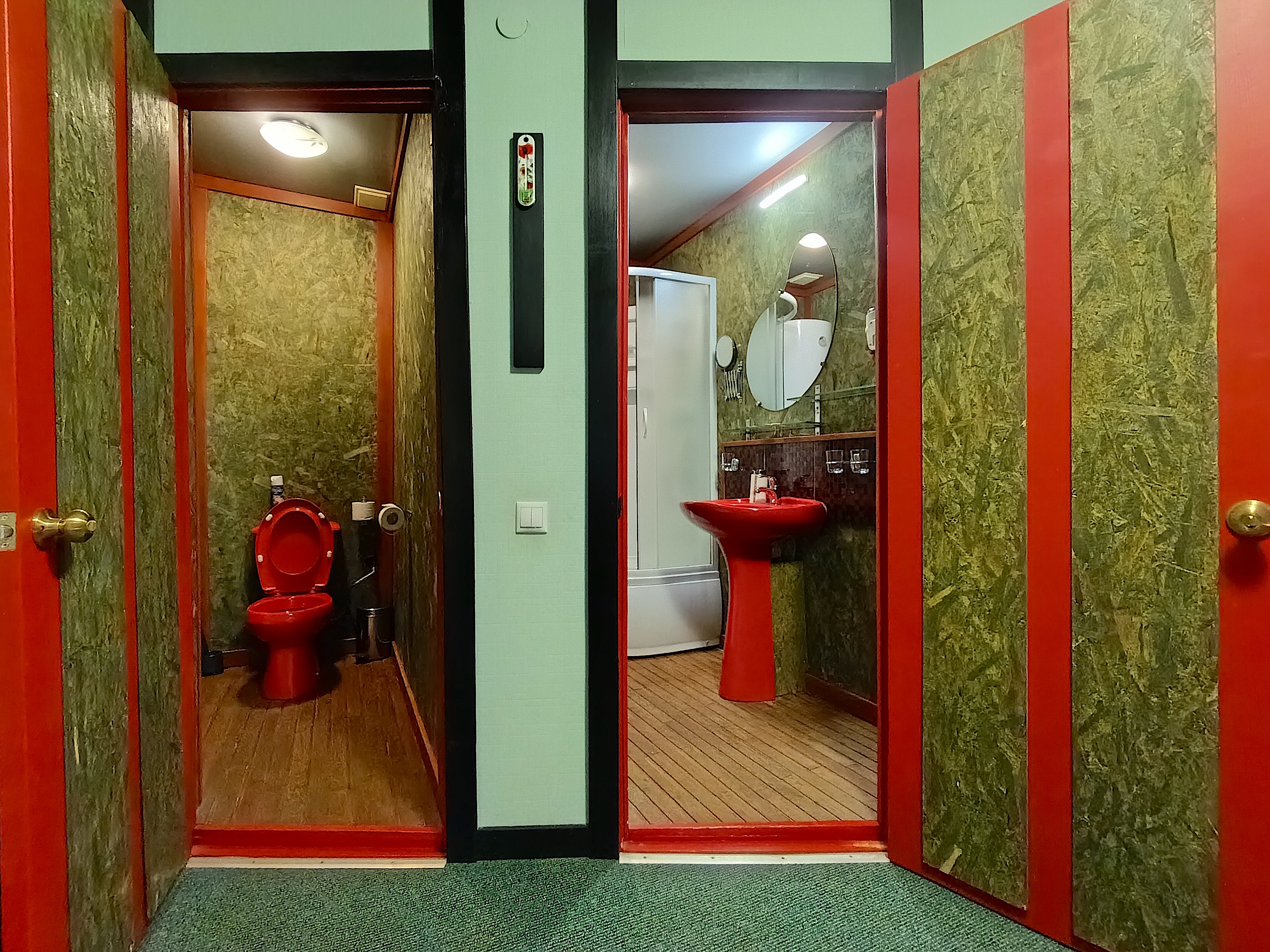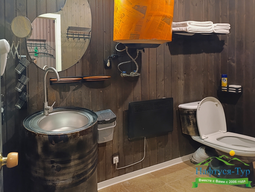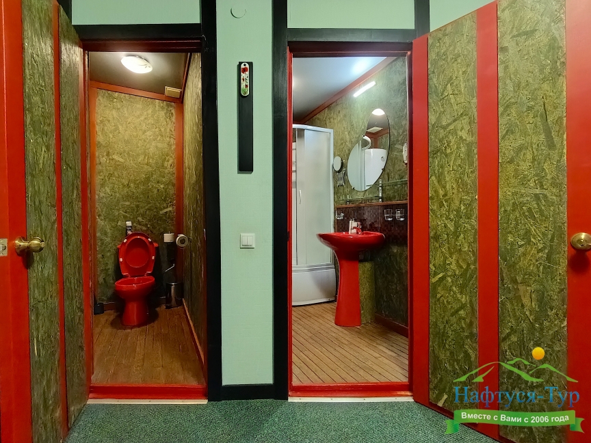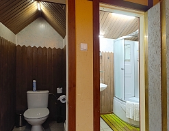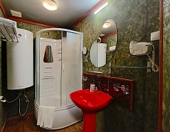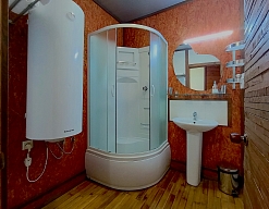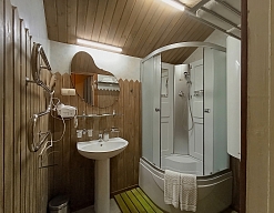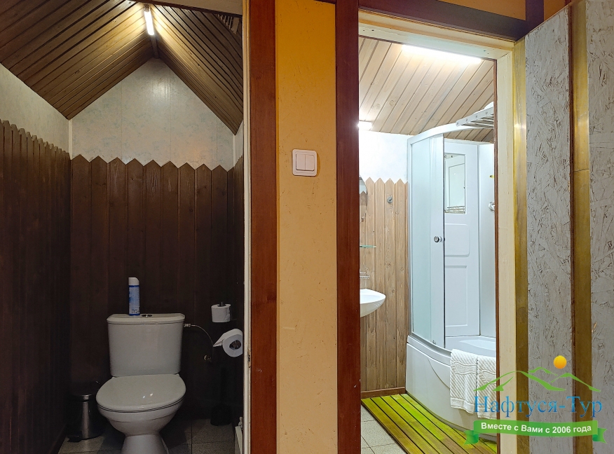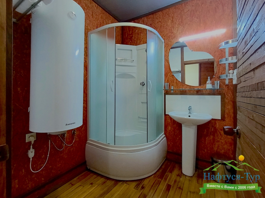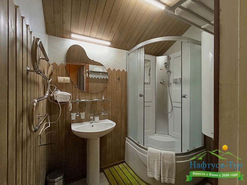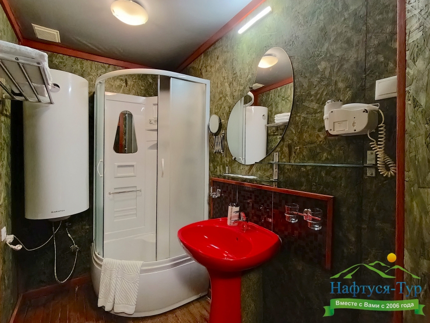 с душевой кабиной, тапочки, туалетные принадлежности, фен, халат