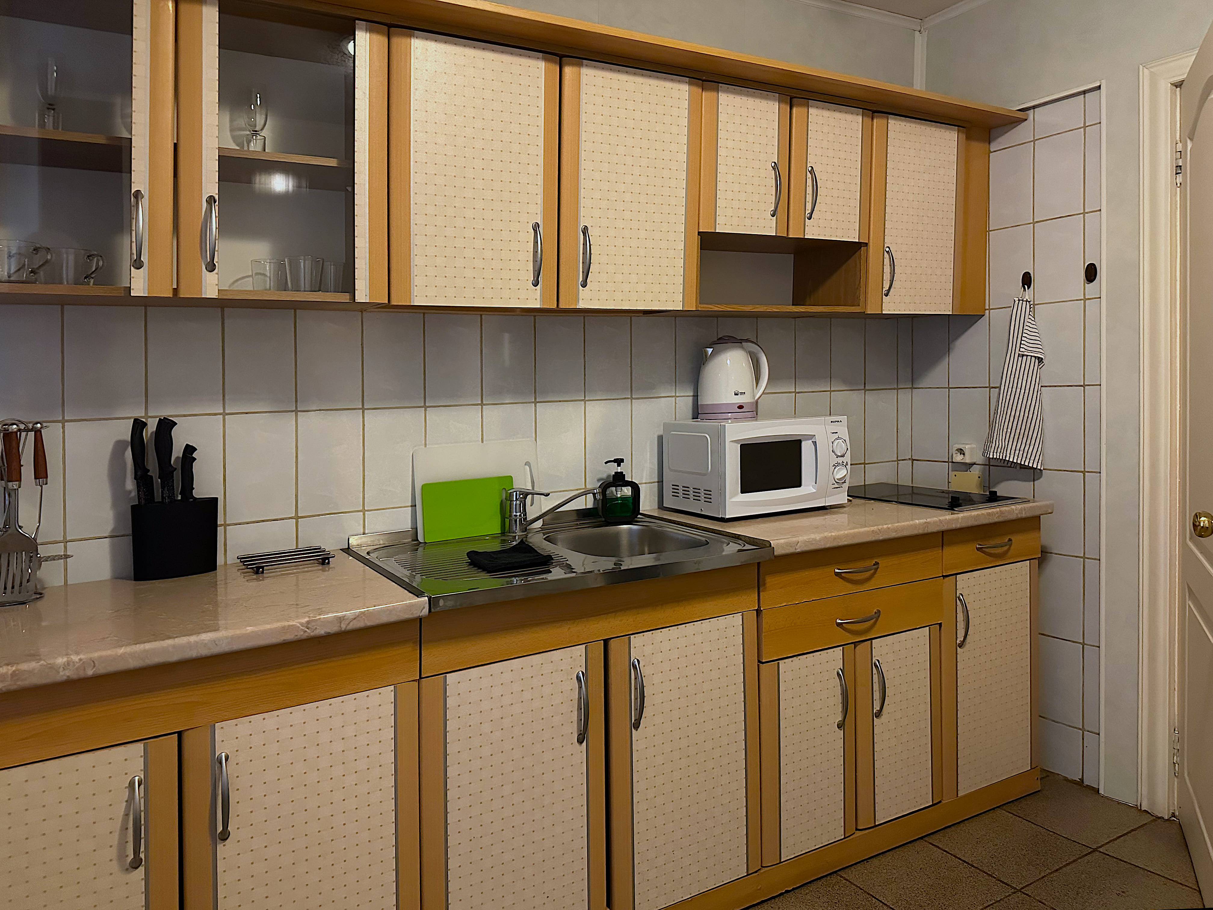 гладильная доска, кондиционер, микроволновая печь, набор посуды, телевизор ЖК, телефон, утюг, холодильник, чайный набор посуды, электрочайник