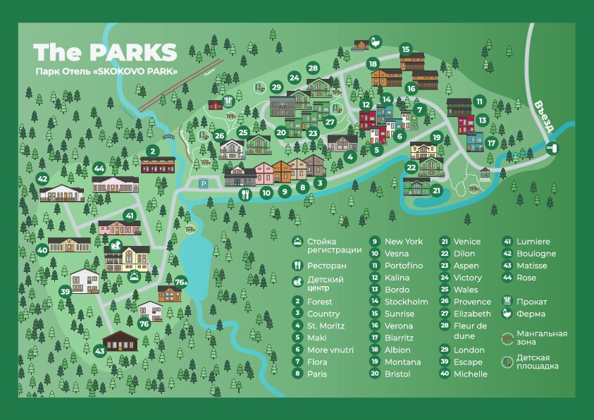 Наше пространство создано для спокойного, здорового, творческого отдыха, для тех, кто ценит безопасность, комфорт и стиль размеренной загородной жизни. Мы находимся в 46 км от Москвы и предоставляем в краткосрочную и долгосрочную аренду коттеджи разной ценовой категории - от элитных шале, от площадью 400м2, до уютных апартаментов. Территория отеля, площадью 20 Га, облагорожена ландшафтным дизайном. Имеются общественные зоны BBQ и детские площадки. Для активного отдыха у нас представлены площадки для ходьбы для волейбола, прокат велосипедов, трасса для скандинавской тренировки, зона для фитнеса и занятий. Зимой работает лыжная школа и прокат лыж, сразу за территорией помещения профессиональная лыжная трасса (ратрак).