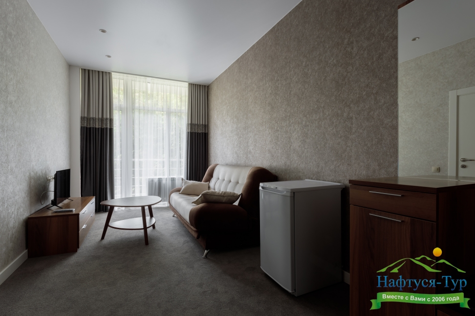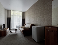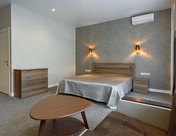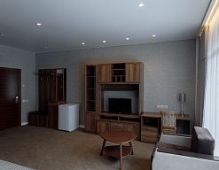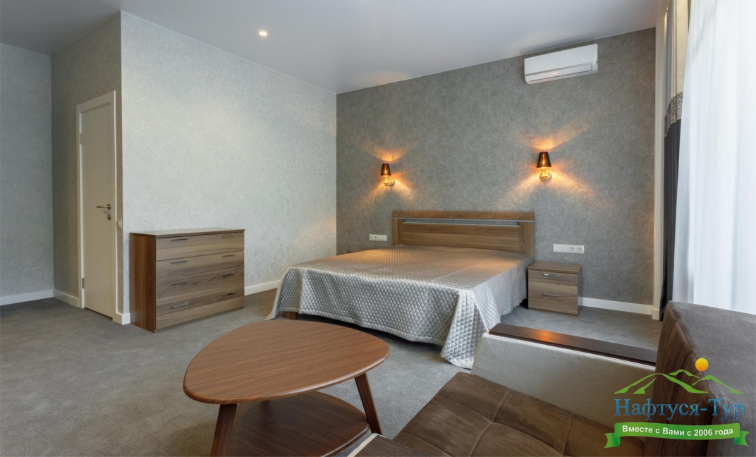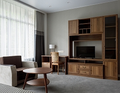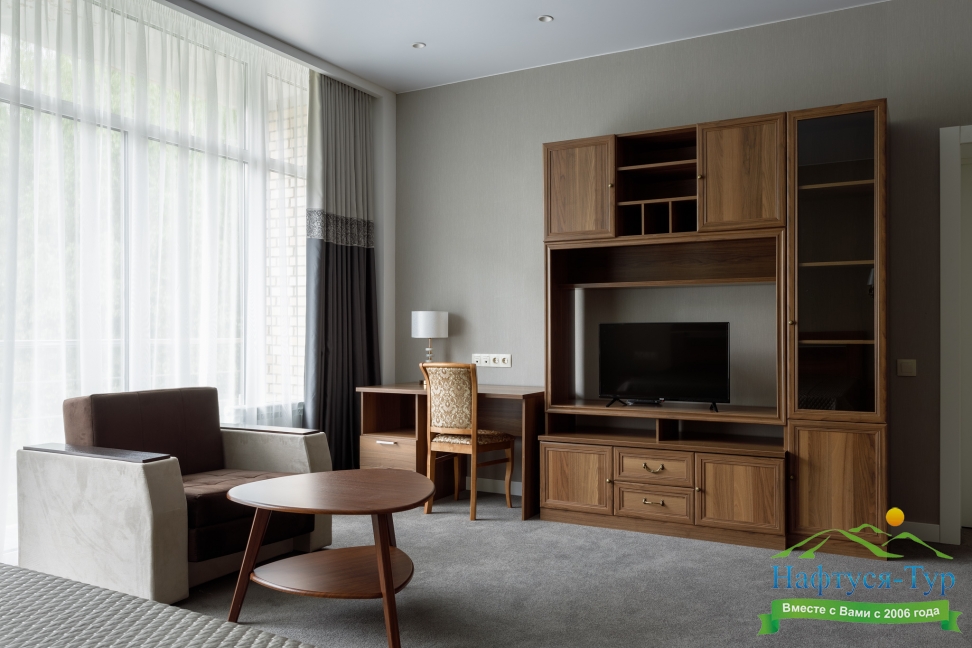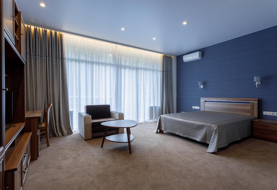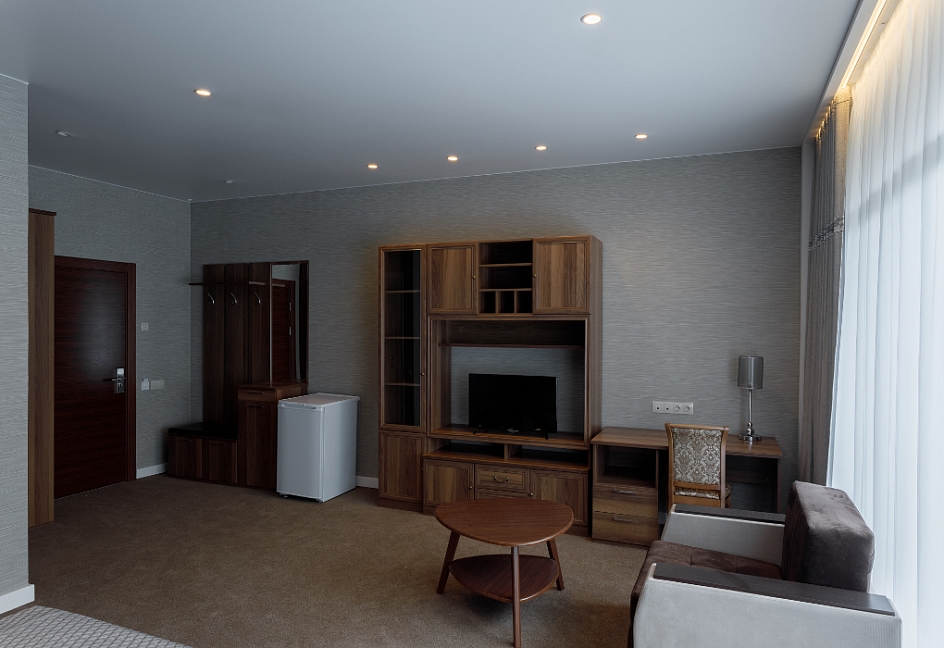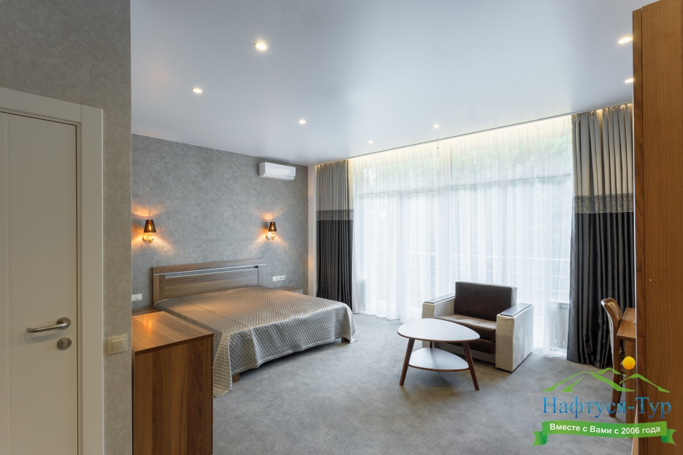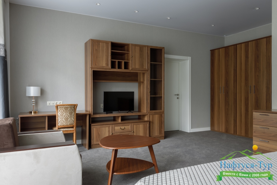 в номере двуспальная кровать (160х200),две прикроватные тумбочки, кресло раскладное, журнальный столик, гарнитур, письменный стол, стул, телевизор, шкаф для одежды, чайник, набор посуды