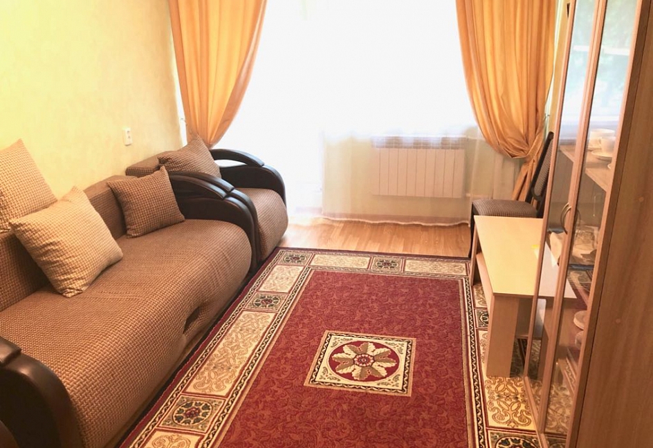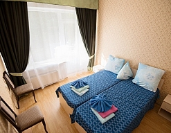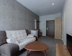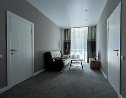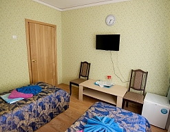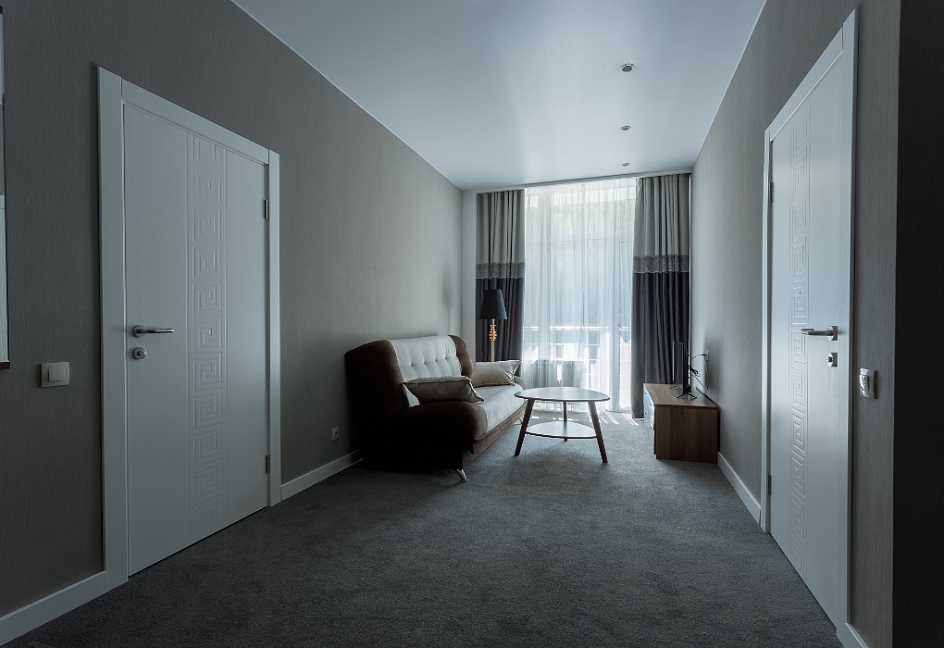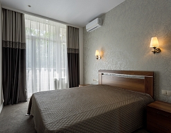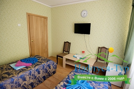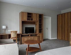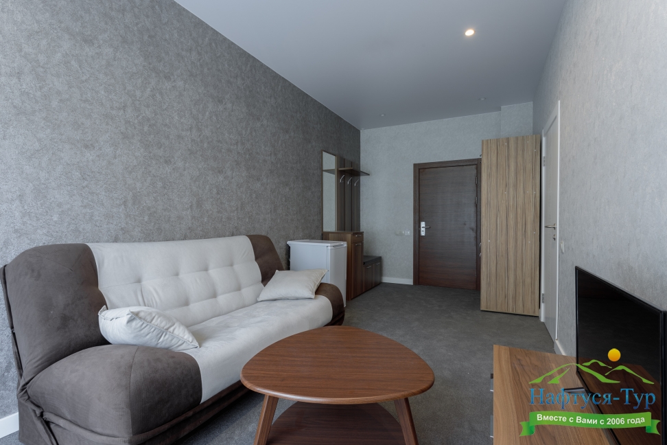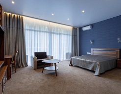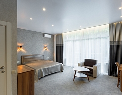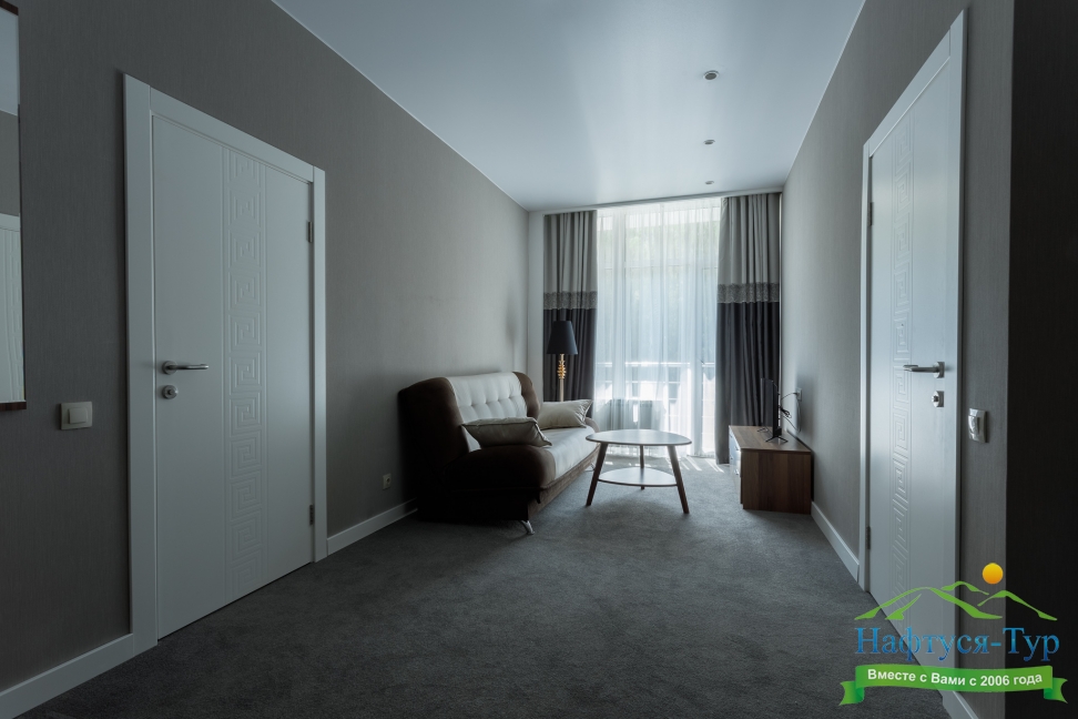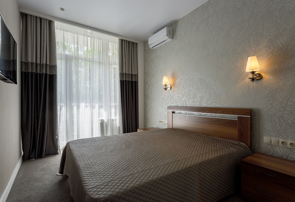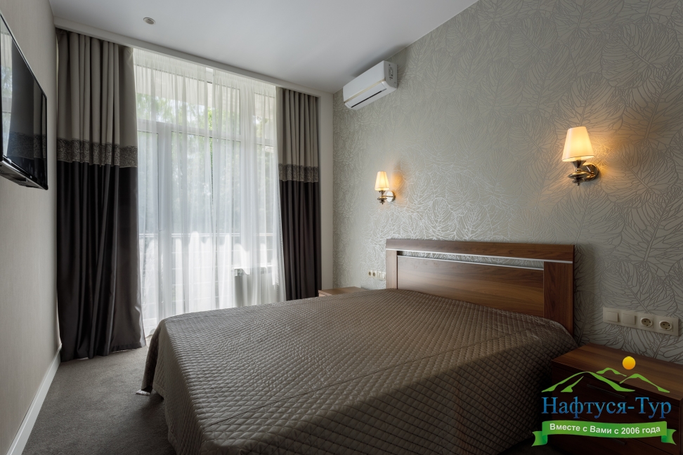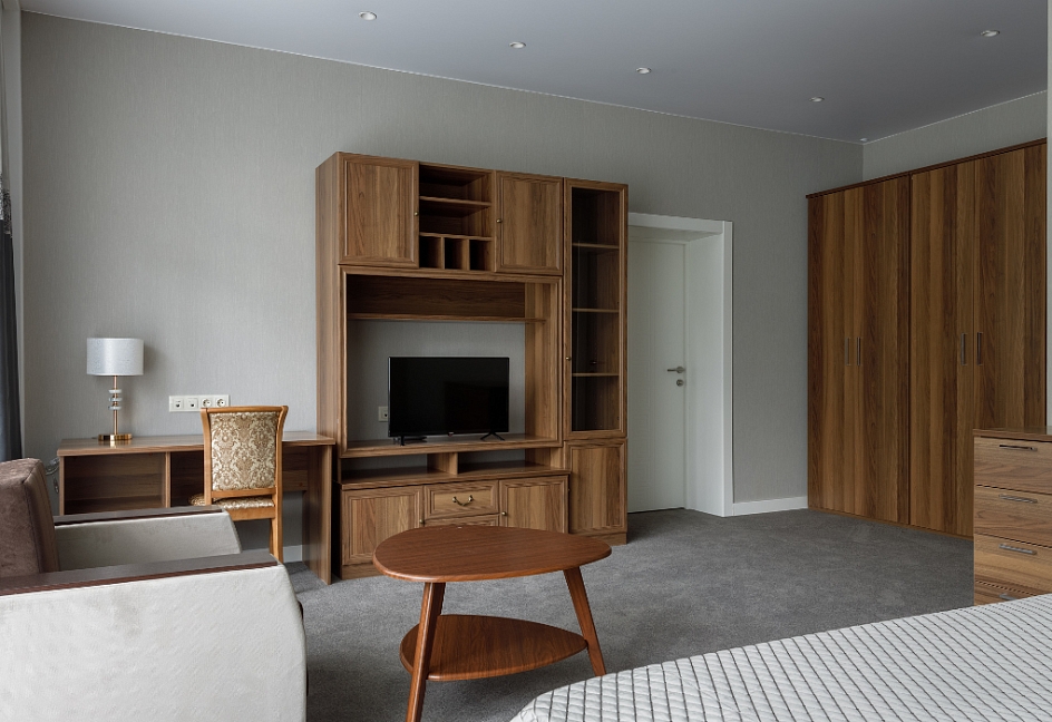 в номере двуспальная кровать (160х200),две прикроватные тумбочки, кресло раскладное, журнальный столик, гарнитур, письменный стол, стул, телевизор, шкаф для одежды, чайник, набор посуды