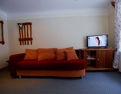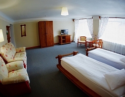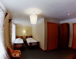 вешалка, зеркало, кровати односпальные /одна двуспальная кровать, прикроватные тумбочки, стол, столик журнальный, стулья, шкаф
