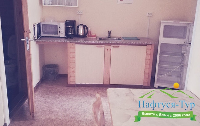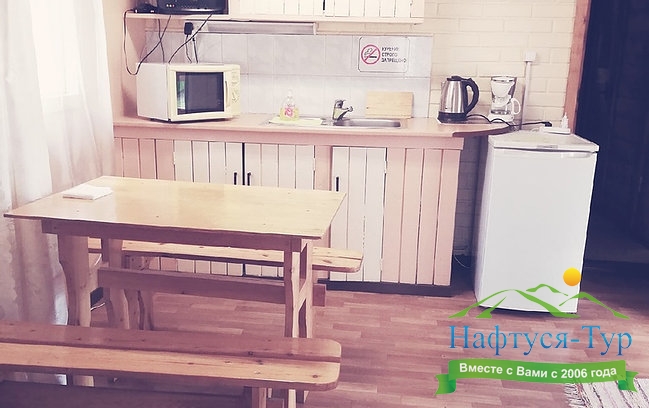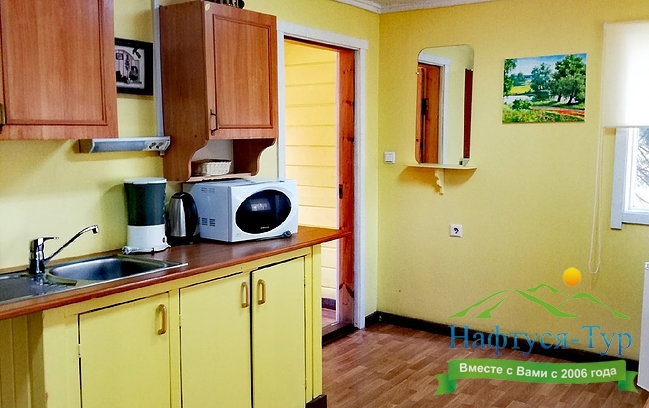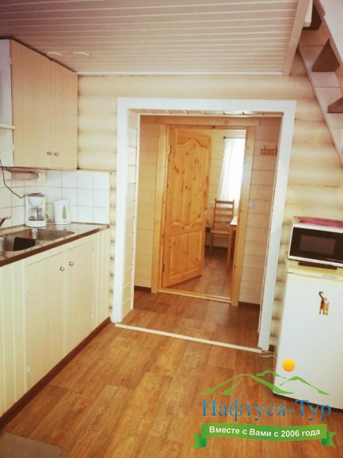 Домик на двоих. Удобное расположение ванной комнаты. Тёплый пол (как и во всех домах на территории). Мы готовили исключительно на свежем воздухе на мангале, поэтому необходимости в плите не было.