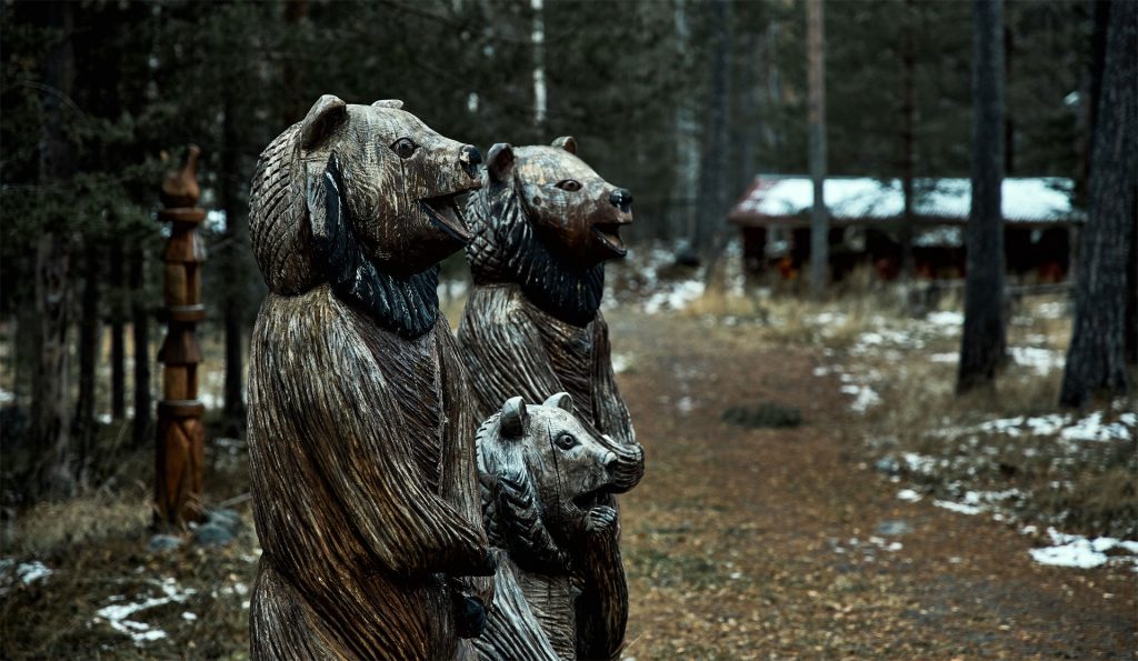 - на берегу озера расположены две русские дровяные бани
