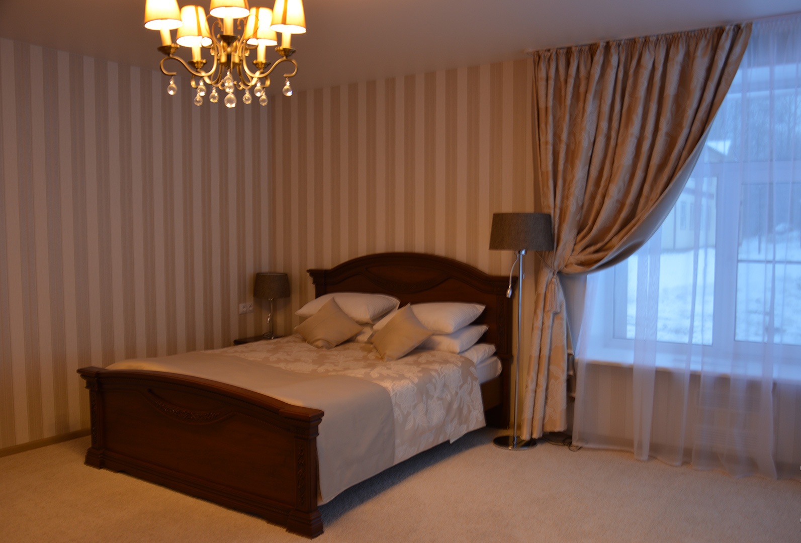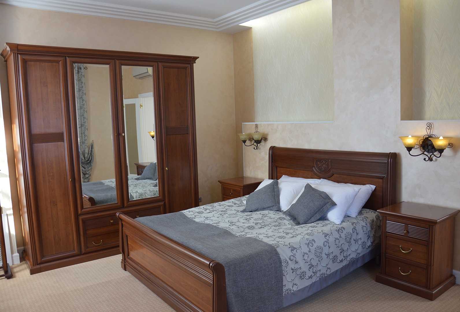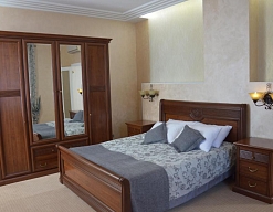 диван, зеркало, кровати односпальные /одна двуспальная кровать, прикроватные тумбочки, стол, стулья, тумба, шкаф