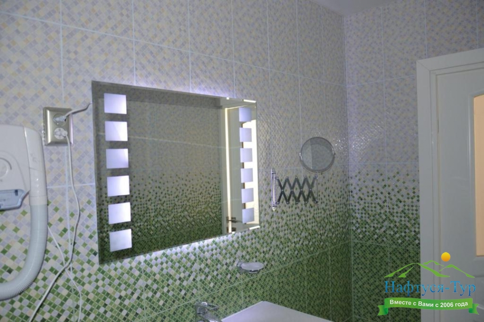 с душем или ванной, туалетные принадлежности, фен
