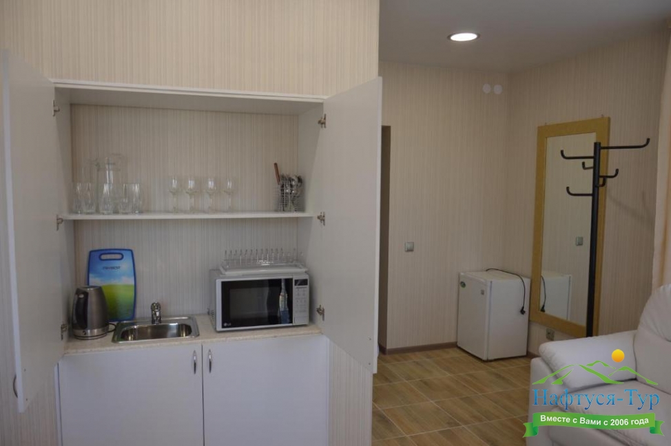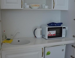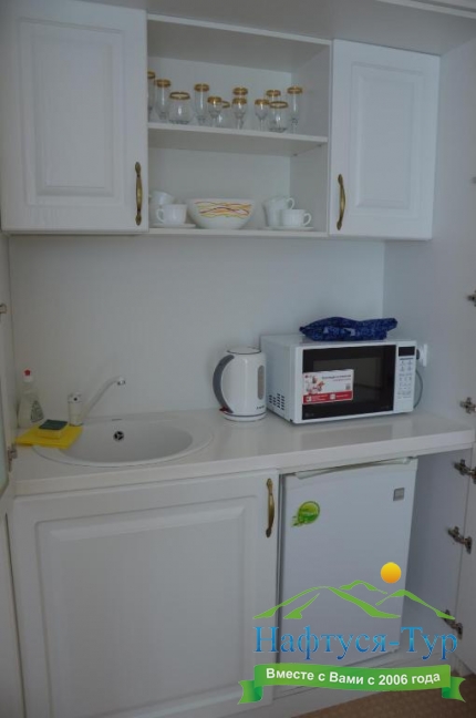 микроволновая печь, телевизор, холодильник, чайный набор посуды, электрочайник