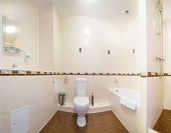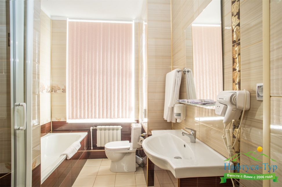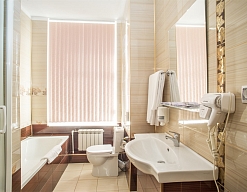 с ванной или душевой кабиной, туалетные принадлежности, фен