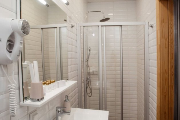 с душевой кабиной, тапочки, туалетные принадлежности, фен, халат