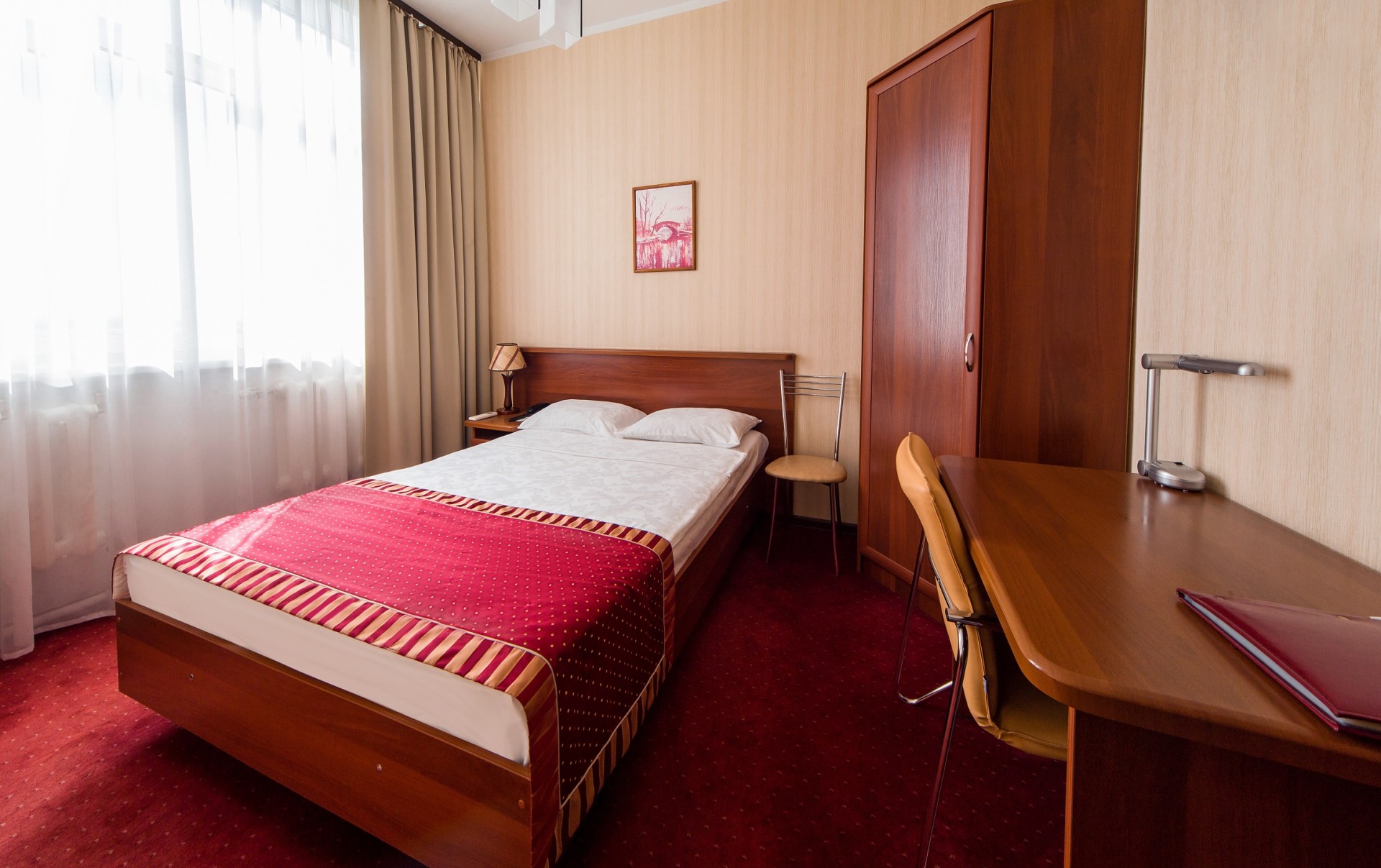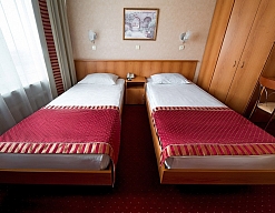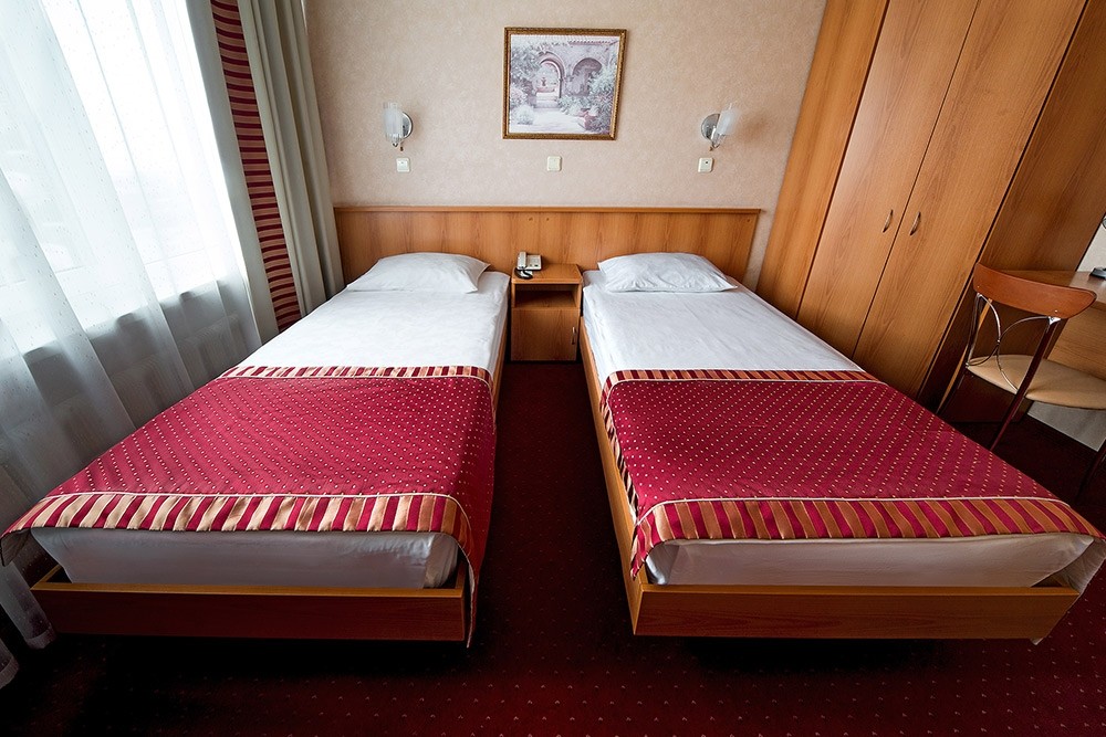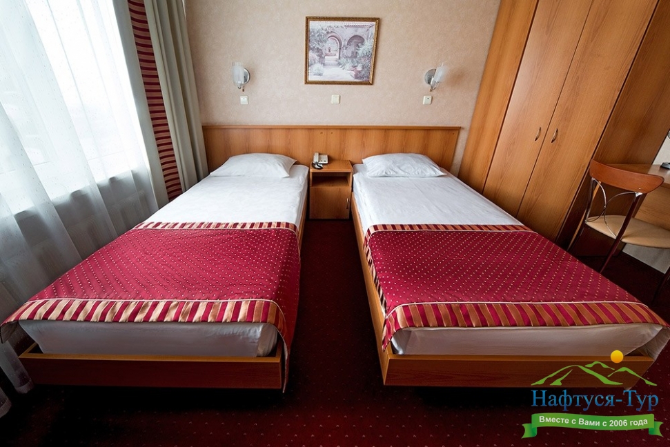 кровати односпальные, прикроватные тумбочки, стол, стул, шкаф