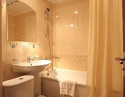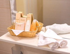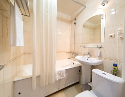 с ванной/душем, тапочки, туалетные принадлежности, фен