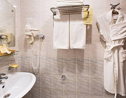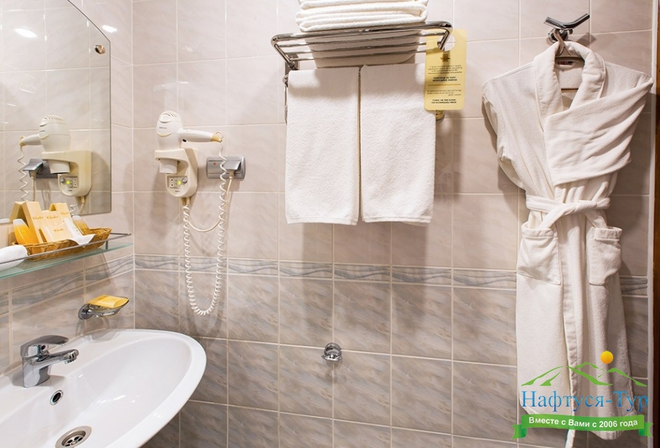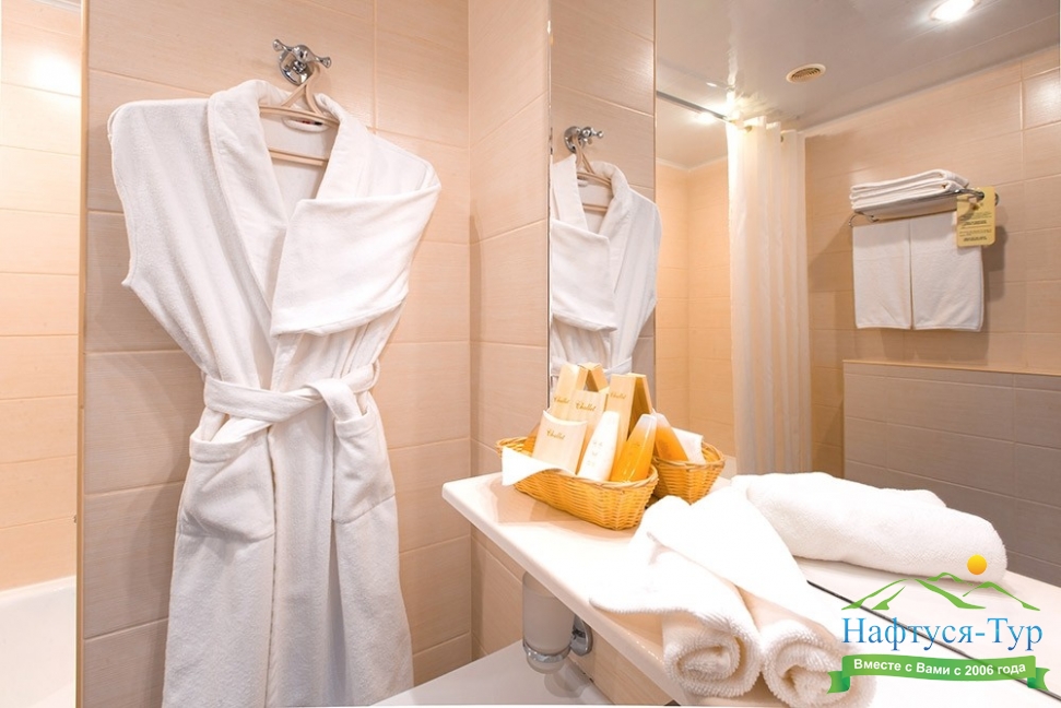 с ванной, тапочки, туалетные принадлежности, фен, халат