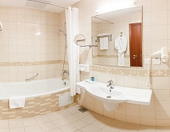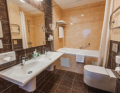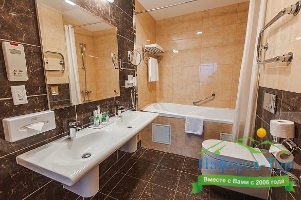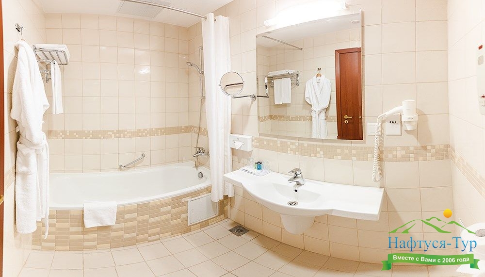 с ванной и душевой кабиной, тапочки, туалетные принадлежности, фен, халат