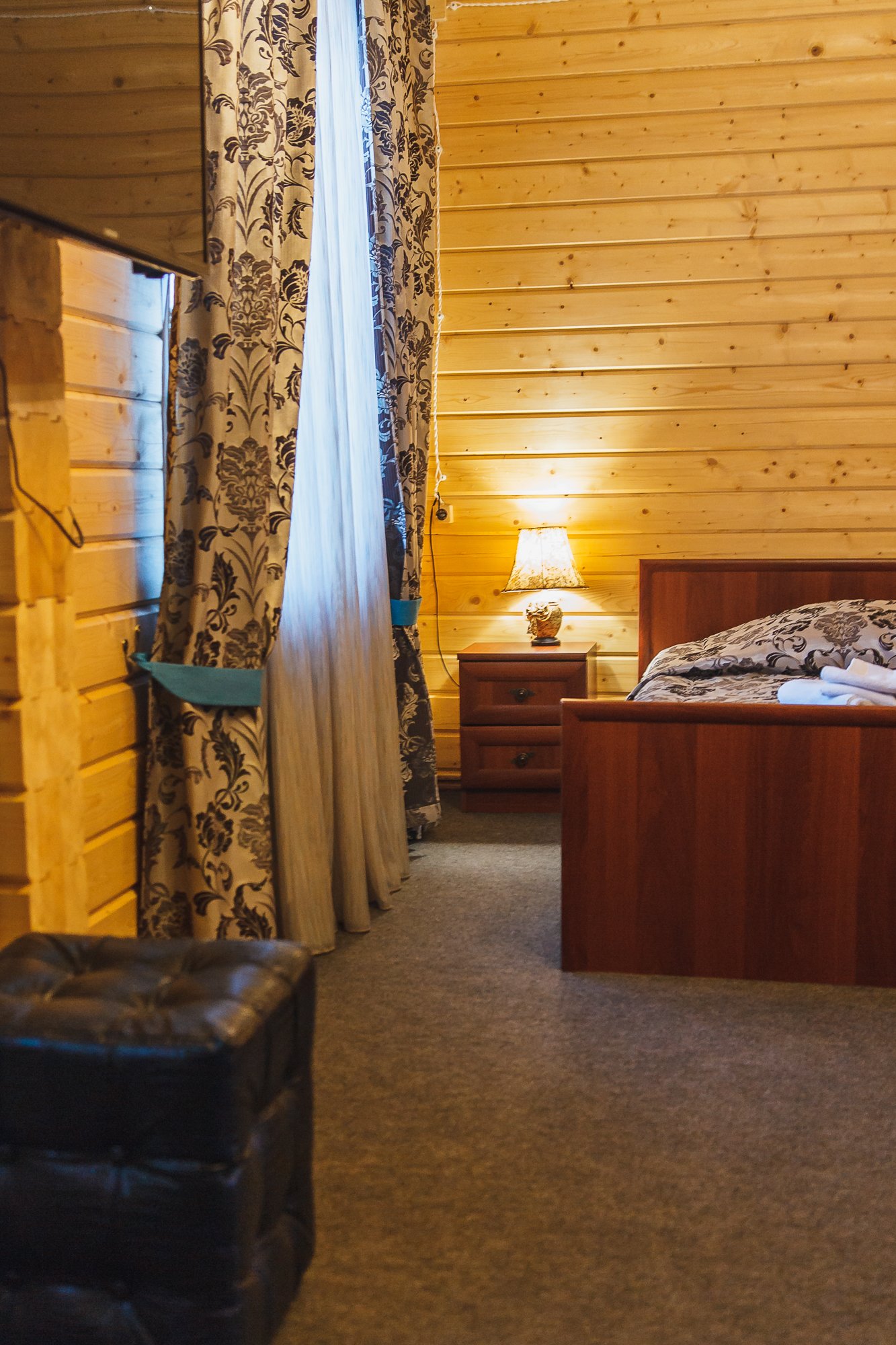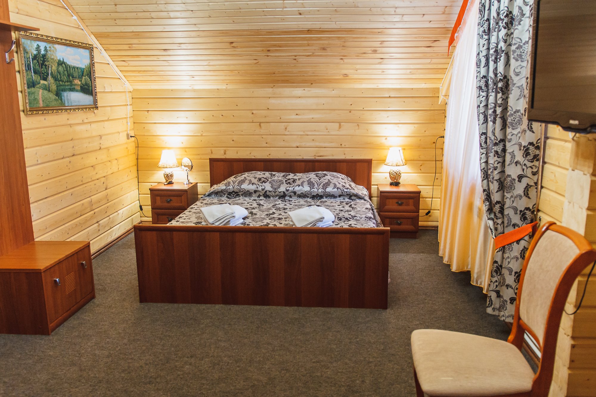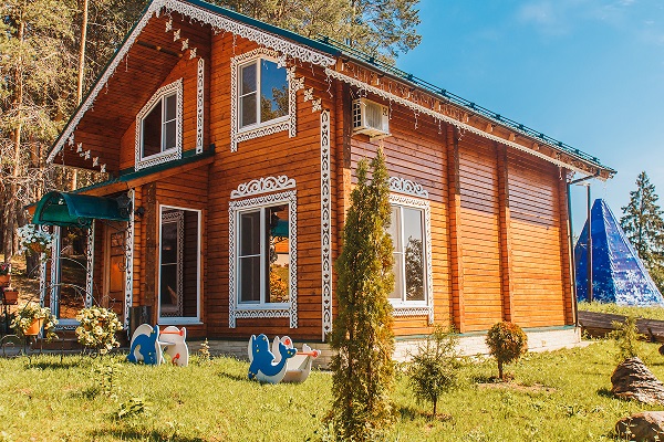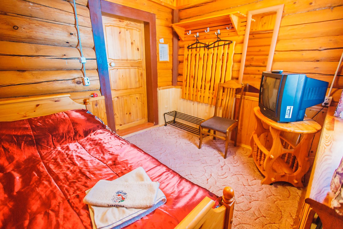 Для проживания дорогих гостей в «Вотчине» подготовлены яркие коттеджи-«теремки» из натурального дерева, как будто только что сошедшие со страниц любимых сказок. В коттеджах очень уютная обстановка: удобные номера разного уровня комфорта со всем необходимым: мебелью, телевизорами, холодильниками, кухнями, но самое главное то, что из окон видно сказочный терем Деда Мороза.
